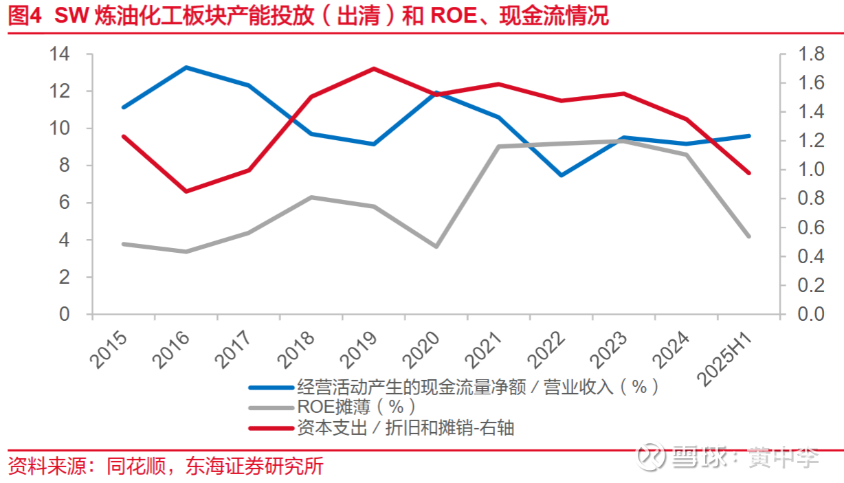 这张图中,研报作者总结了申万化工三级子行业中炼油化工板块的几家公司的资本支出情况,以资本支出/折旧和摊销来刻画。可以发现,2025H1的资本支出/折旧和摊销这一比例和2016年低点差不了多少了。是不是意味着2025年石化行业资本开支已经基本见底了呢?如果没有,那么2026年石化行业资本开支总该见底了吧。