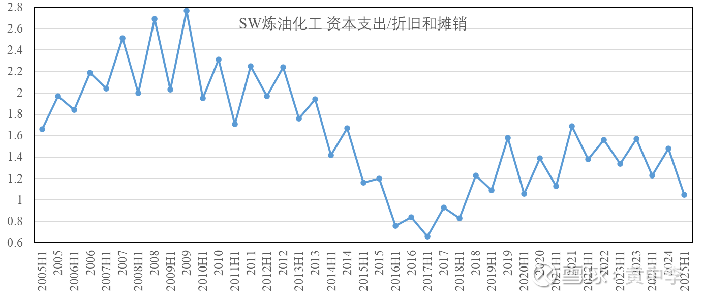 不过笔者还是不放心,因为2025H1的资本开支/折旧和摊销数据和全年的年度数据缺乏可比性。因为石化行业不少央国企(说的就是你,三桶油),资本开支往往下半年尤其四季度居多,而折旧摊销全年是均匀分摊的,因此上半年的资本支出/折旧摊销会较全年度的要偏低。