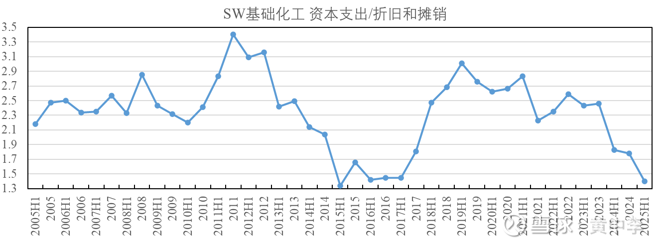 (4)由于申万炼油化工板块仅有10家公司左右,且未包括万花、华鲁、宝丰、卫星等化工巨头,因此代表性不够。所以笔者用类似方法,以申万基础化工这一一级子行业为代表,探寻其资本开支/折旧及摊销的历史变化情况。