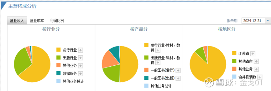 这是2024年的情况,其它年份也是大同小异。从中可以看出发行、出版业务是其业务的核心。其中发行、出版教材、教辅又是其产品的核心。江苏省就是它收入的最核心的地区。