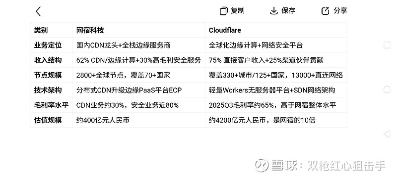 一.美股对标公司Cloudflare,昨夜涨3.59%今夜盘前大涨14%。 网宿科技是Cloudflare的A股核心对标公司。二者的对标性主要体现在两大维度: 1. 业务模式高度匹配:双方均以CDN业务为基础,延伸覆盖网络安全、边缘计算能力,属于CDN+安全+边缘基建的综合服务商。 2. 技术路线同步转型:Cloudflare提出AI Agent重构互联网的战略后,网宿科技也凭借2800+全球边缘节点,构建“模型接入-推理优化-场景落地”全链路能力,与Cloudflare向边缘AI算力服务商转型的路线完全一致。 目前两者主要差异在于规模估值和业务结构,Cloudflare当前市值约4200亿元人民币,是网宿科技的10倍左右,但网宿科技正在通过CDN提价、AI Agent落地等实现业绩追赶,估值重估空间较大。