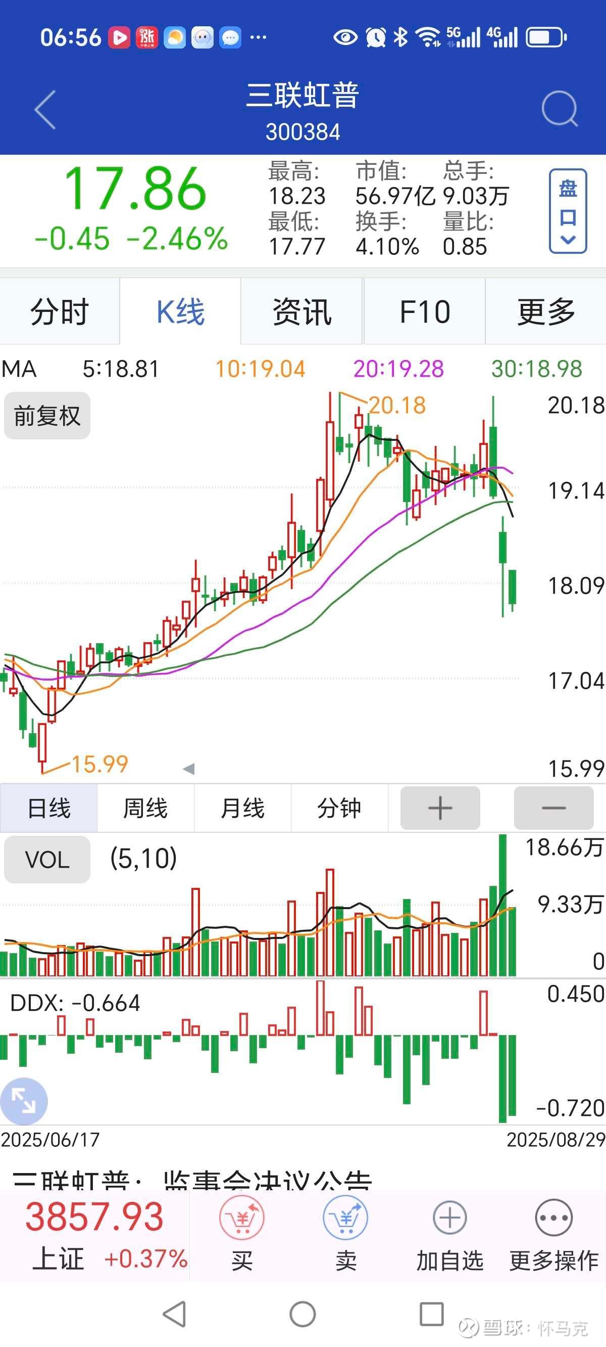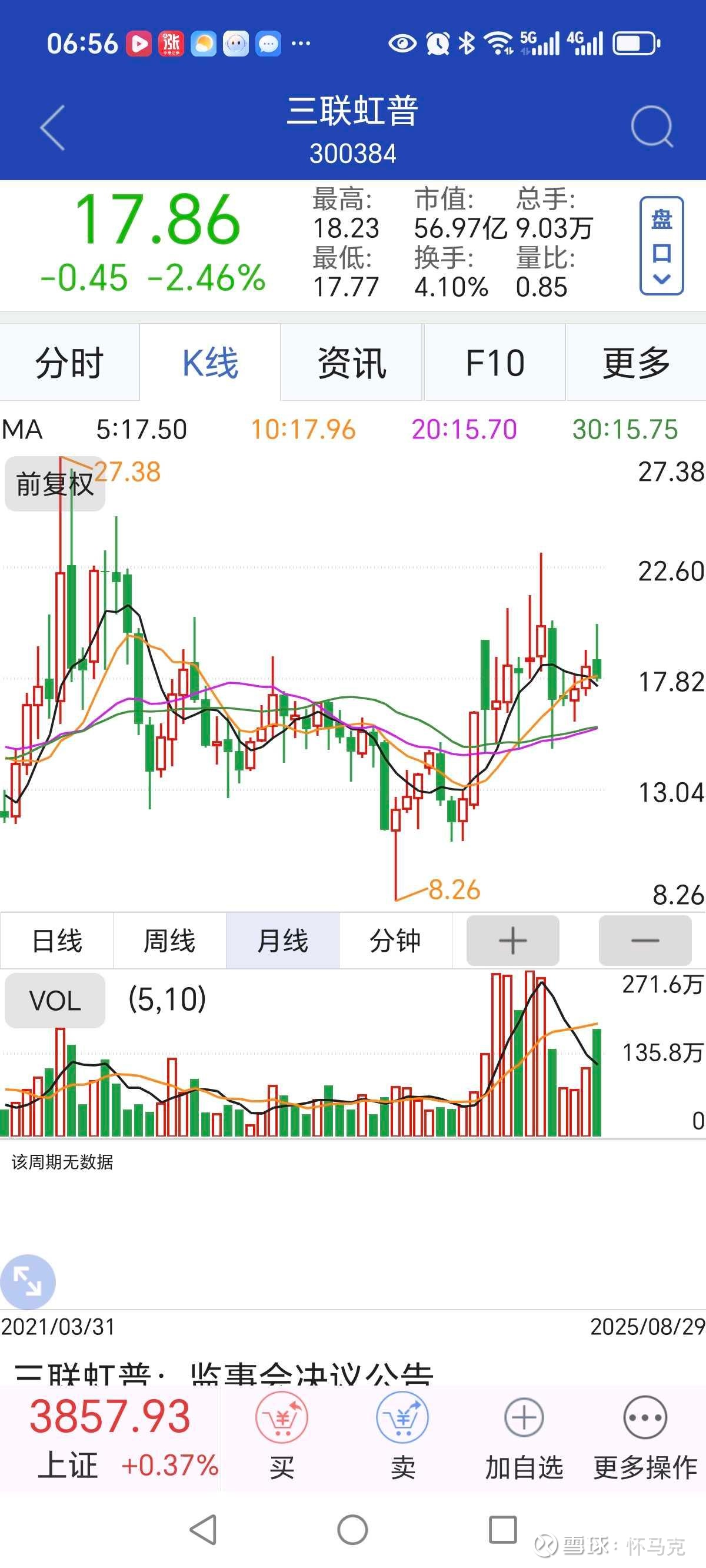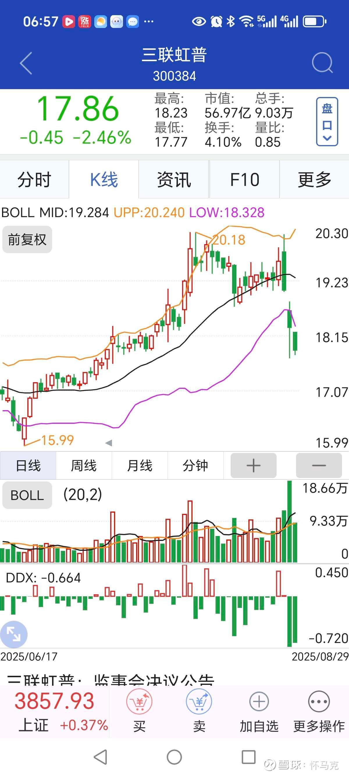 从日K线数据来看,三联虹普(300384)在 2025 年 8 月上旬股价持续攀升,于 8 月 10 日创出近期新高 20.18 元,随后开始回落。截至最新交易日,股价收于17.86元,跌幅2.46%,全天运行区间17.77-18.23元,成交总额1.62亿元,换手率4.10%,量比0.86,呈现缩量续跌态势。