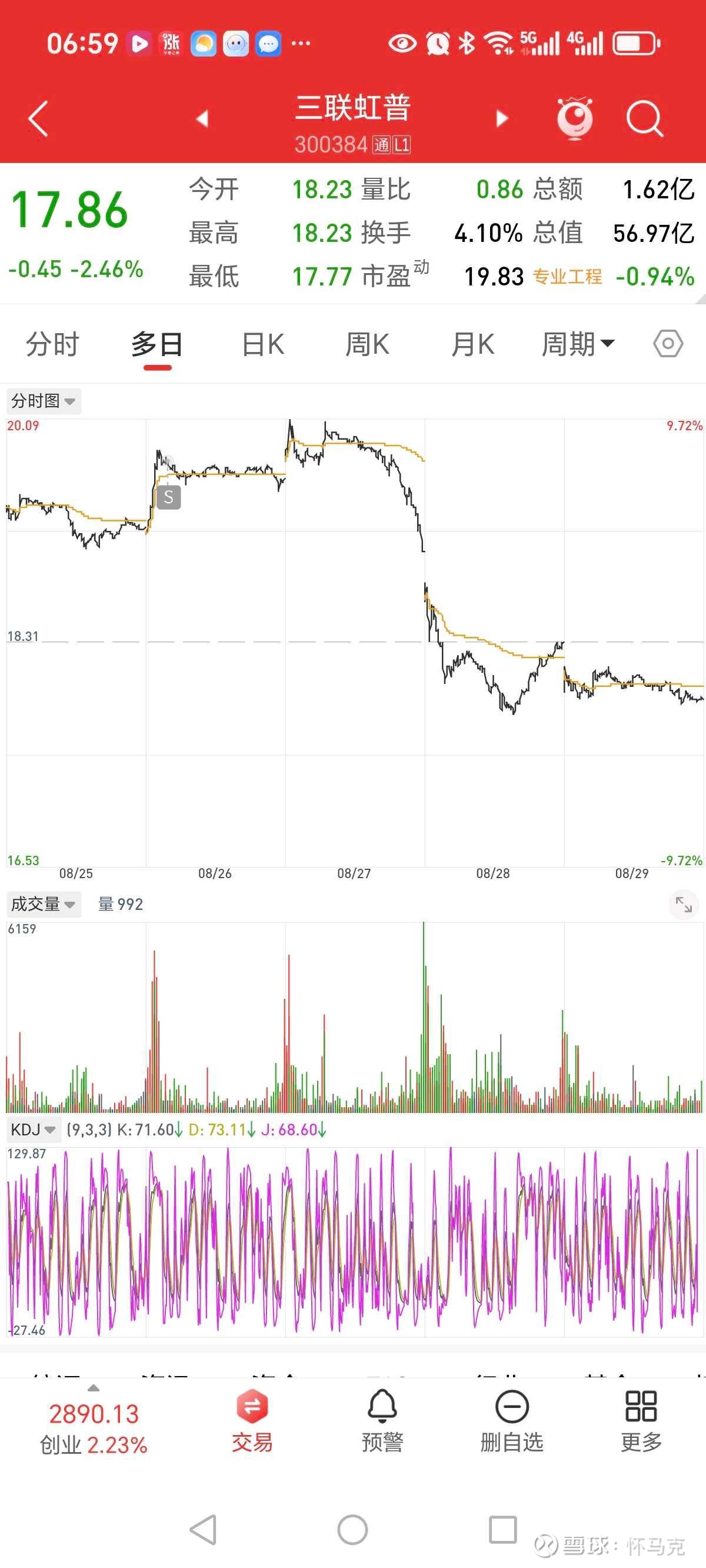清仓后次日股价冲高至20.14元(差4分达前高),随后连续两日下行,周四爆量下跌,周五K线在周四下影线内运行,最终跌破布林线下轨,收于17.86元,当前已空仓。