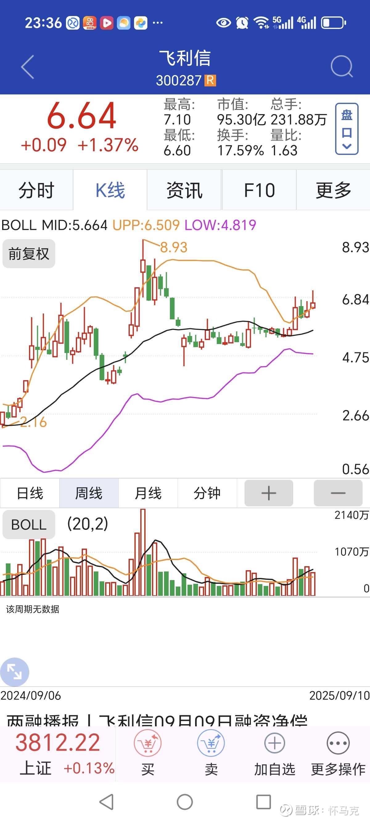 近期走势:近10个交易日,飞利信走势波动较大。9月1日涨幅为7.6797%,9月8日涨幅为5.9655%,但9月9日跌幅为2.9630%。截至9月10日,收盘价为6.64元,当日涨幅为1.3740%。