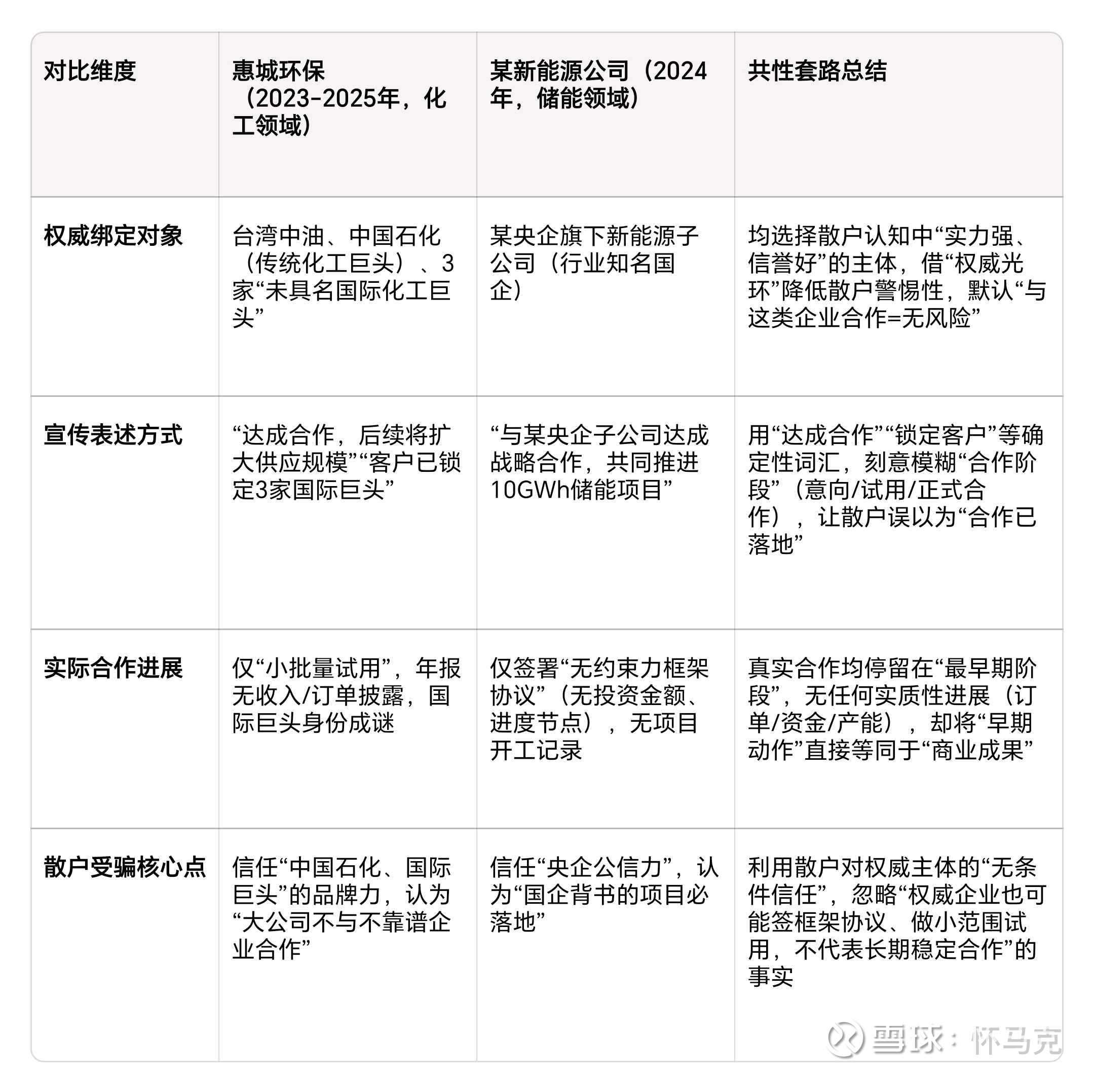 “权威绑定”的核心是通过关联行业知名企业或国企,利用散户对“权威主体的盲目信任”制造合作假象,本质是将“弱关联”包装成“强合作”,惠城环保与某新能源公司(2024年)的操作高度雷同。