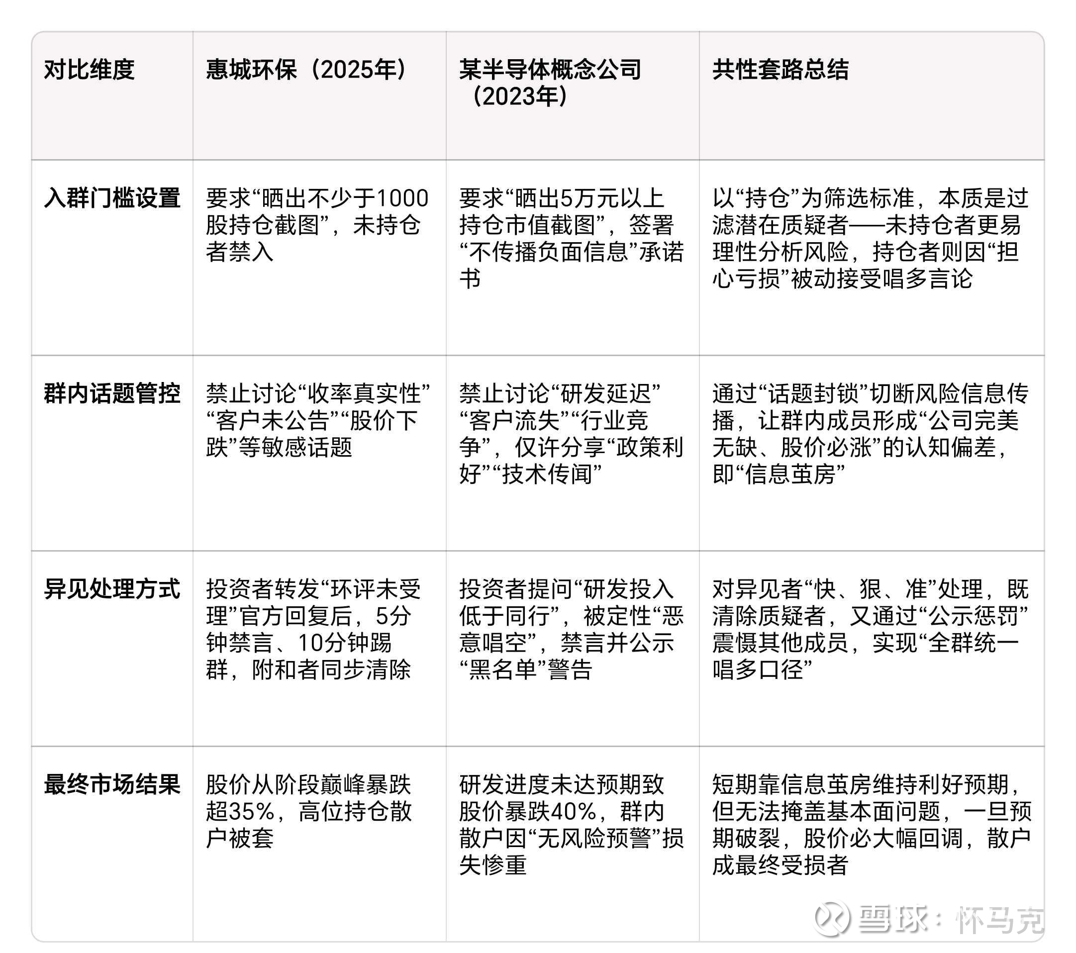 “圈层过滤”的本质是通过设置门槛、封锁话题、清除异见,为散户构建“只有利好、没有风险”的信息孤岛,惠城环保与某半导体概念公司(2023年)的“群控”操作几乎复刻。