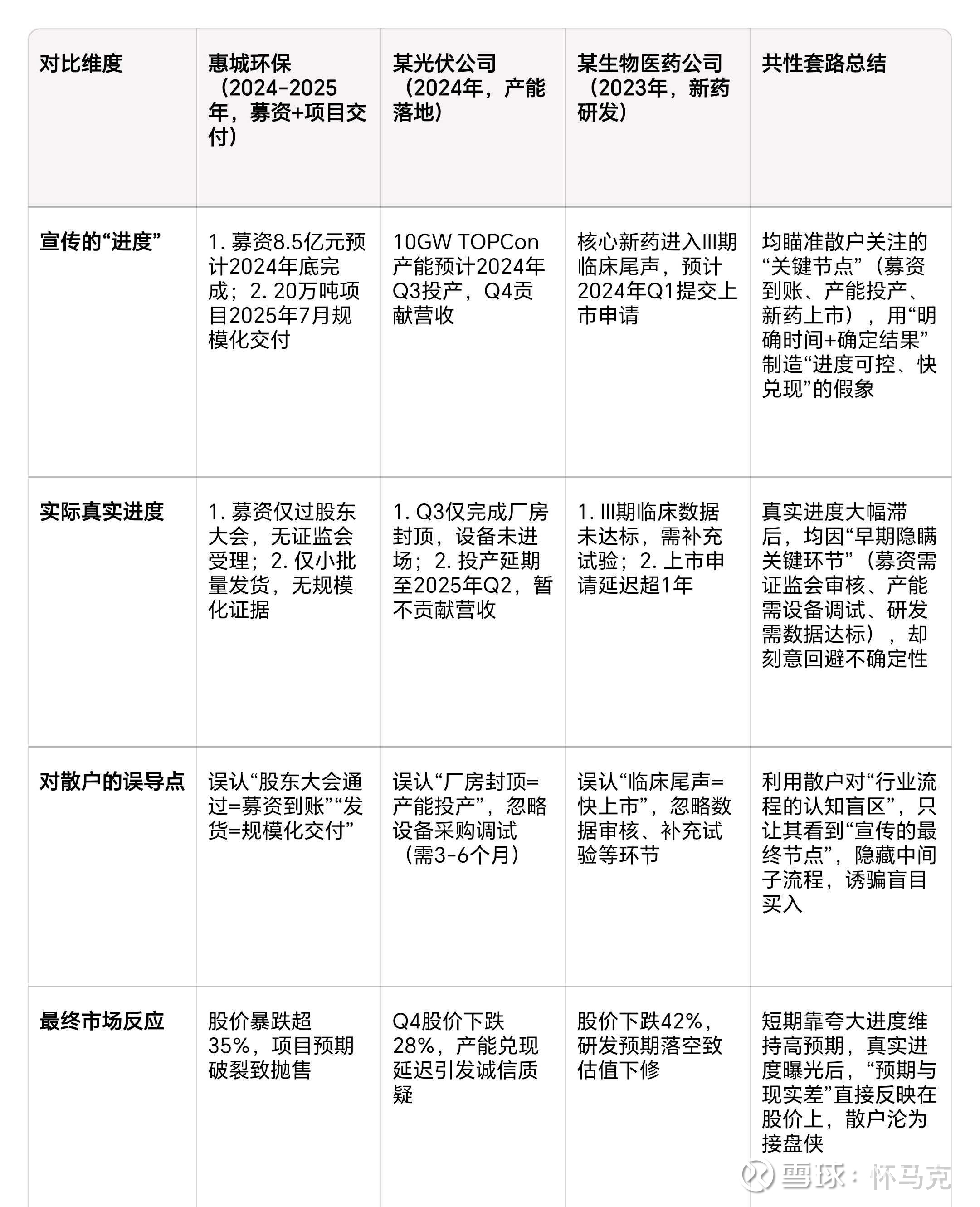 对散户的误导点在于,散户误认惠城环保“股东大会通过=募资到账”“发货=规模化交付”;误认某光伏公司“厂房封顶=产能投产”,忽略设备采购调试(需3-6个月);误认某生物医药公司“临床尾声=快上市”,忽略数据审核、补充试验等环节。本质是利用散户对行业流程的认知盲区,只让其看到宣传的最终节点,隐藏中间子流程,诱骗盲目买入。
