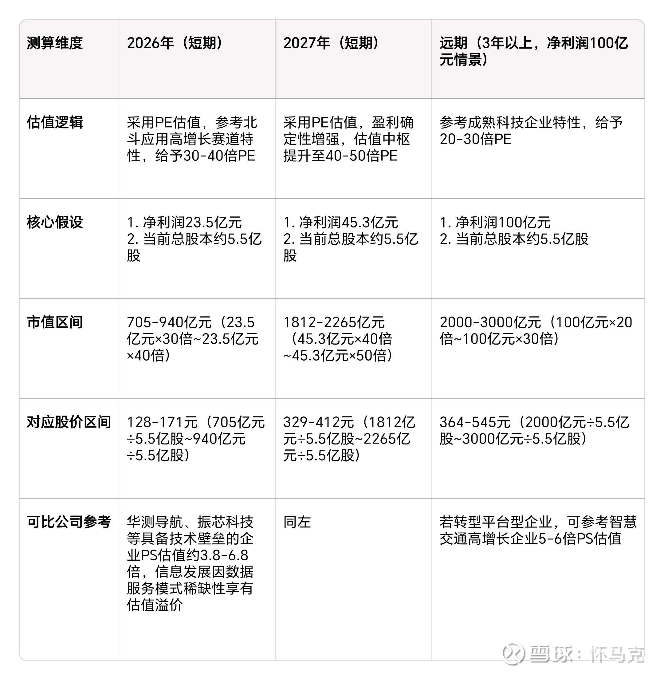 短期(1-2年)采用PE估值,参考北斗应用高增长赛道特性,给予2026年30-40倍PE,2027年因盈利确定性增强,估值中枢提升至40-50倍;长期(3年以上)若转型平台型企业,参考智慧交通高增长企业,给予5-6倍PS。
