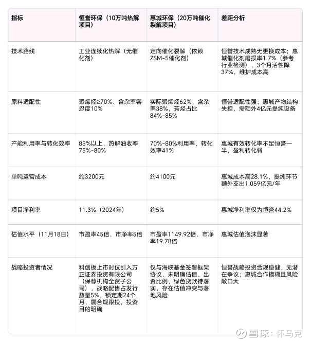 指标 恒誉环保(10万吨热解项目) 惠城环保(20万吨催化裂解项目) 差距分析