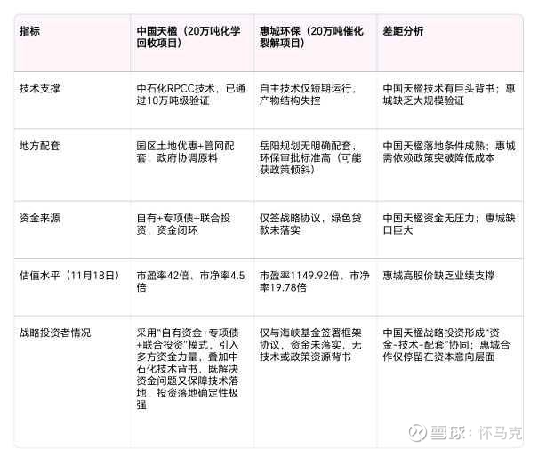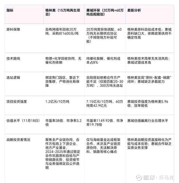 综合分析,惠城环保相关帖子的夸大表述、公司宣传口径的频繁变更、项目落地条件的模糊不清,与2025年11月18日155.40元收盘价对应的高估值形成鲜明反差,既误导市场认知,也加剧投资风险。与恒誉环保(合规稳健的战略投资)、格林美(产业协同型合作)、中国天楹(资金闭环式布局)相比,惠城环保的战略投资仅停留在框架协议层面,缺乏明确的估值约定、出资细节及产业链协同价值,落地不确定性远高于同行;项目在技术成熟度、成本控制、原料保障等核心维度也存在显著短板,盈利转化效率与估值水平严重背离。