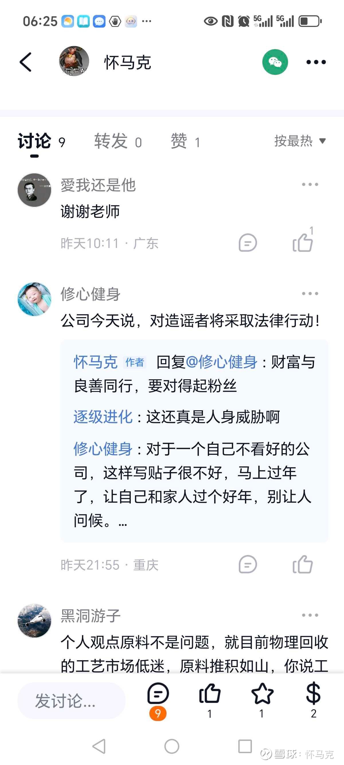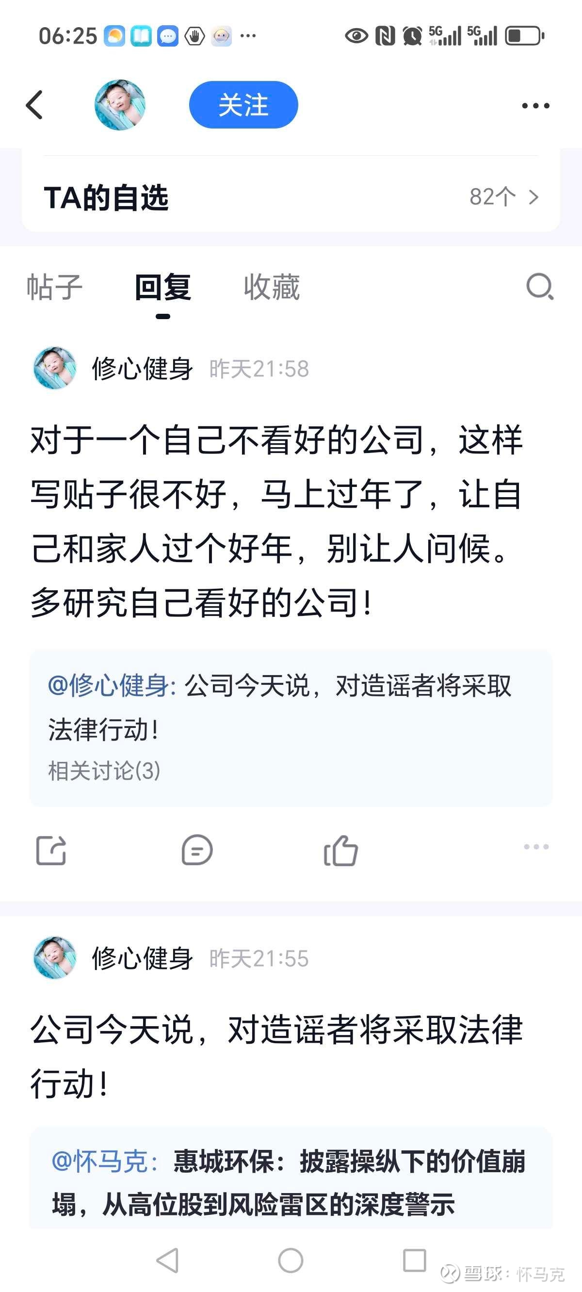 这两条评论,是典型的“避实就虚+道德/威胁绑架”的话术套路。其一,他完全回避惠城环保披露操纵、原料缺口、技术缺陷等核心争议点,反而拿“过年”说事,用“别让人问候”的模糊威胁转移焦点,本质是不想讨论帖子内容的真实性,只想用情绪压制不同声音;其二,他将“公司宣称采取法律行动”等同于“帖子内容是造谣”,偷换概念——法律行动的前提是“内容失实+侵权”,但截至目前,公司既未拿出反驳帖子细节的证据,也未证明帖子存在造谣行为,他的表态不过是站队公司的无依据发言。