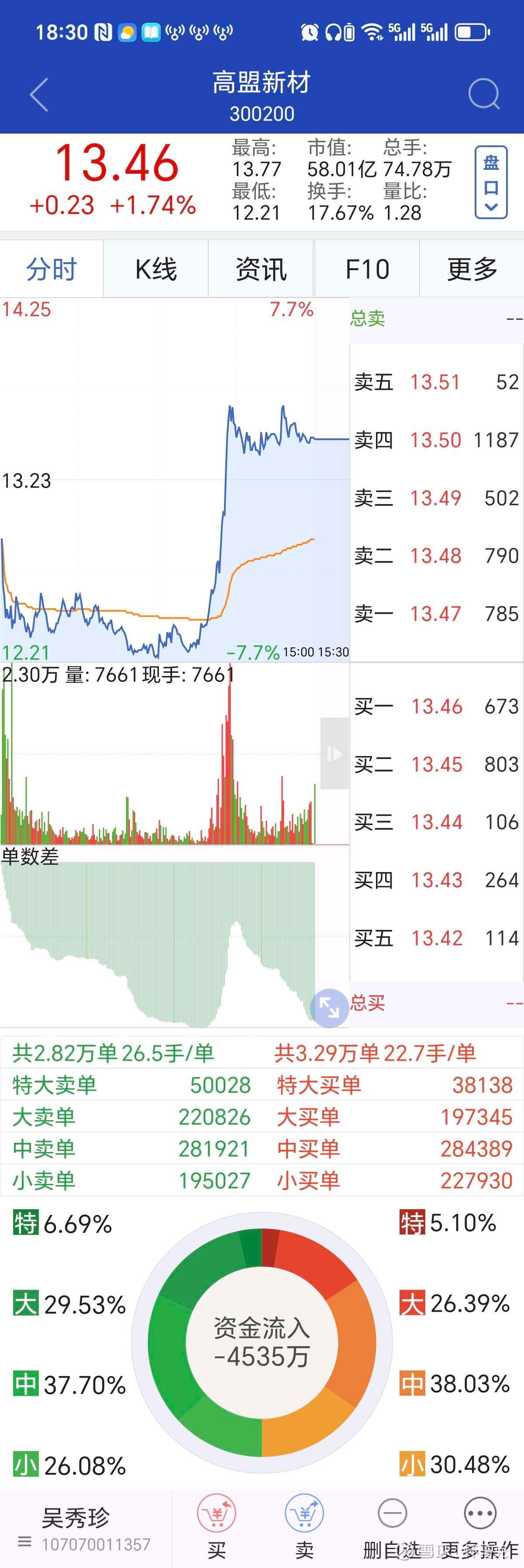 该股早盘下探至12.21元时完成低位加仓,该操作有效摊薄了12.60元的平均持仓成本。午后13:50左右股价出现5分钟涨超2%的快速反弹,14:00后进一步冲高至13.77元压力位,这两个节点都是卖出加仓部分的最佳做T时机,可惜因未盯盘错失机会。当日收盘价13.46元仍高于平均成本,且主力资金净流出超4200万元,当前基本仓持仓未处于被动状态。
