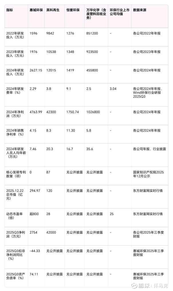 2. 研发投入的匹配度:2024年惠城环保研发投入仅2627.15万元,不足英科再生(12015万元)的1/4,2025年研发费用率仅2.29%,不仅低于英科再生的4.12%、金发科技的3.87%,更低于环保行业3.04%的均值(数据来源:Wind环保行业研报2025Q3、企业2024年年报)。且2024年研发人员人均年薪仅7.46万元,远低于英科再生的20.3万元、恒誉环保的16.7万元、万华化学的35.6万元,难以吸引高端技术人才,所谓“技术壁垒”缺乏资金与人才支撑。