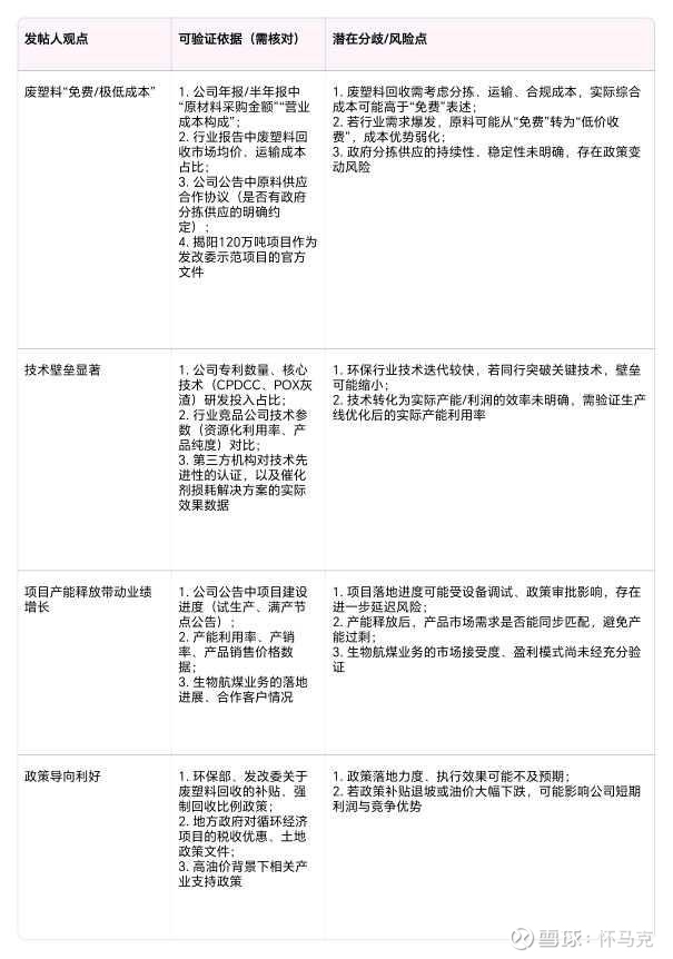 废塑料“免费/极低成本” 1. 公司年报/半年报中“原材料采购金额”“营业成本构成”; 2. 行业报告中废塑料回收市场均价、运输成本占比; 3. 公司公告中原料供应合作协议(是否有政府分拣供应的明确约定); 4. 揭阳120万吨项目作为发改委示范项目的官方文件 1. 废塑料回收需考虑分拣、运输、合规成本,实际综合成本可能高于“免费”表述; 2. 若行业需求爆发,原料可能从“免费”转为“低价收费”,成本优势弱化; 3. 政府分拣供应的持续性、稳定性未明确,存在政策变动风险