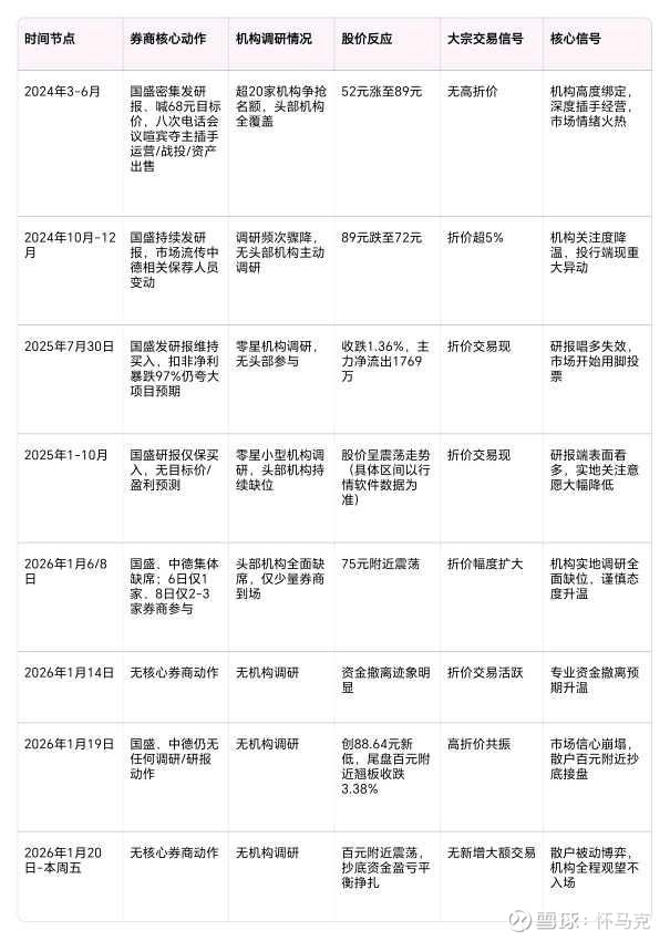 时间节点 券商核心动作 机构调研情况 股价反应 大宗交易信号 核心信号