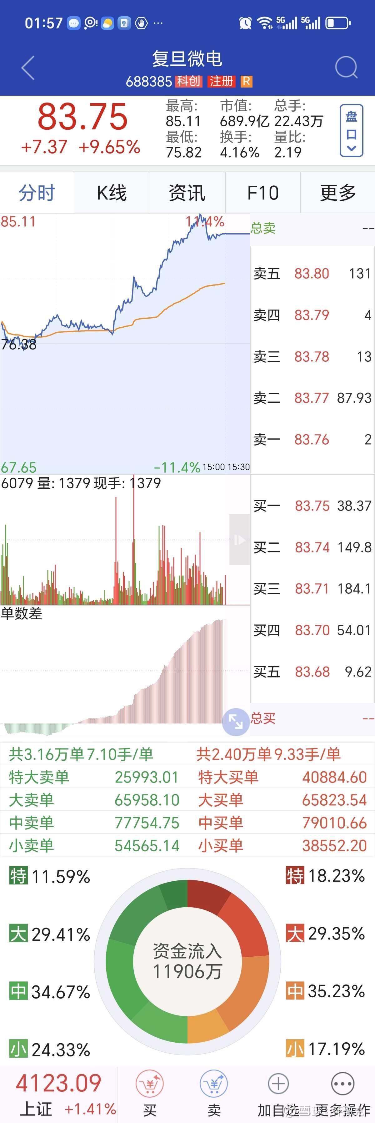 买一:83.75元,38.37手;买二:83.74元,149.8手;买三:83.71元,184.1手;买四:83.70元,54.01手;买五:83.68元,9.62手