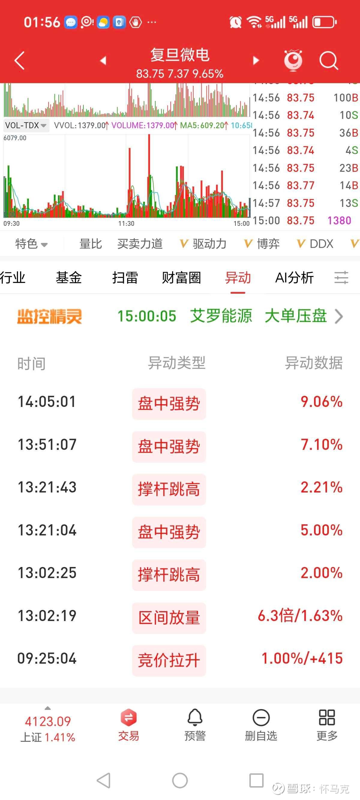 2026年2月9日,复旦微电以77.70元开盘,最终收涨9.65%至83.75元,日内最高价85.11元、最低价75.82元,全天成交额18.04亿元,换手率4.16%,量比2.19。早盘竞价拉升1.00%,午后多次出现“撑杆跳高”“盘中强势”异动,最高涨幅11.4%,最终收于全天高位。近期股价呈现探底回升、放量突破态势,2月4日触及阶段低点75.75元后企稳反弹,9日放量大涨脱离短期震荡区间。拉长周期看,近三个月股价经历高位回调后开始修复,近一年整体维持大区间震荡上行,股性活跃、波动幅度较大。