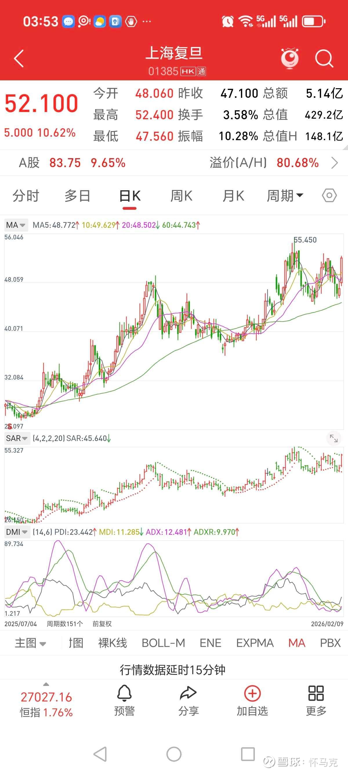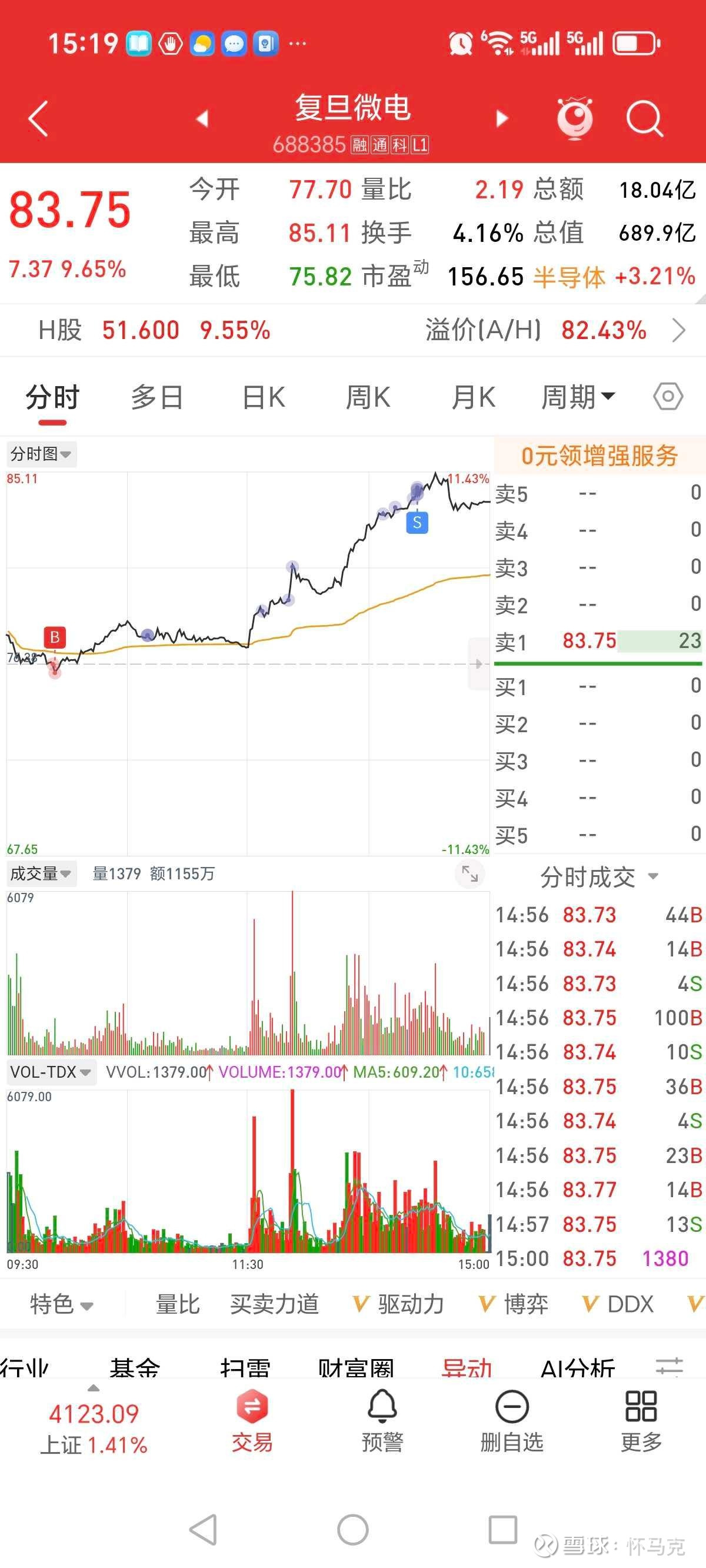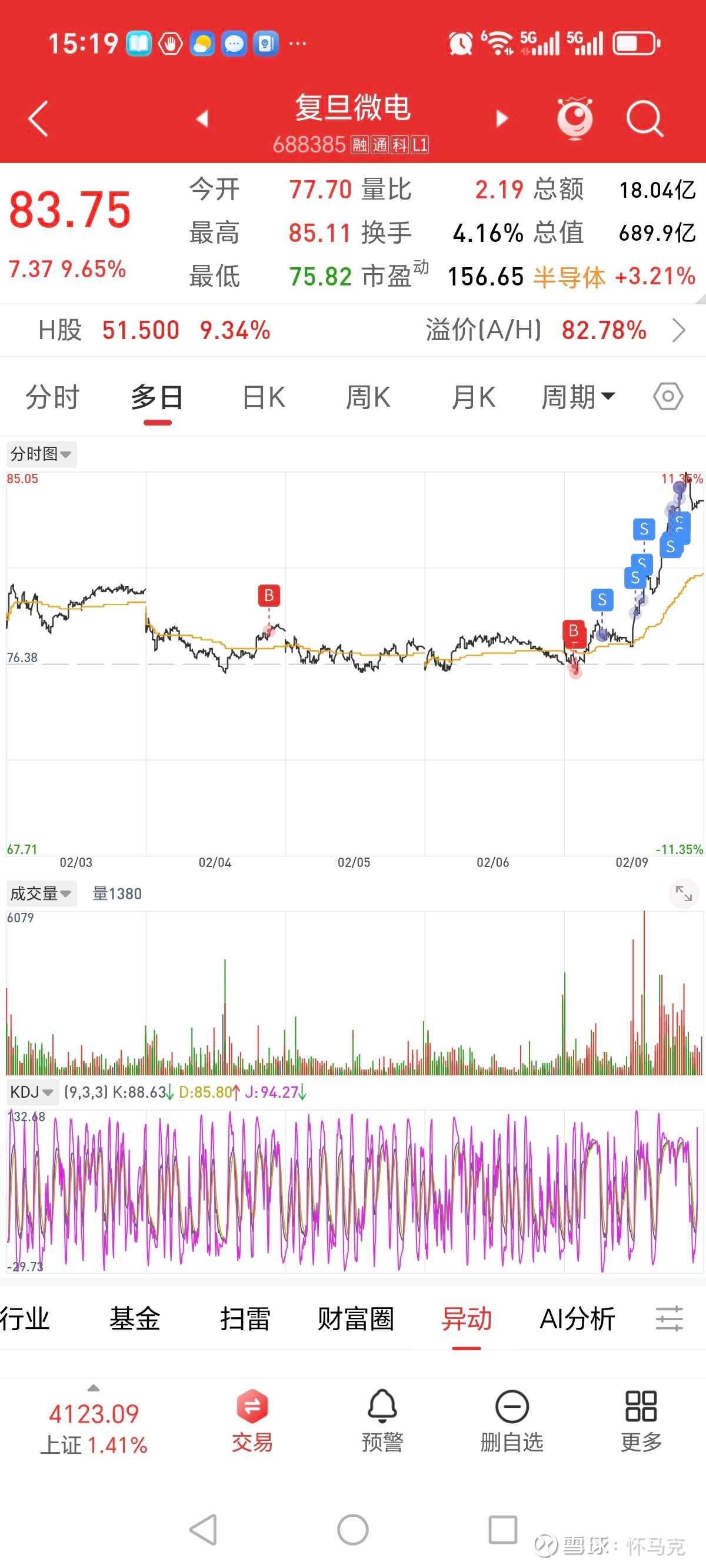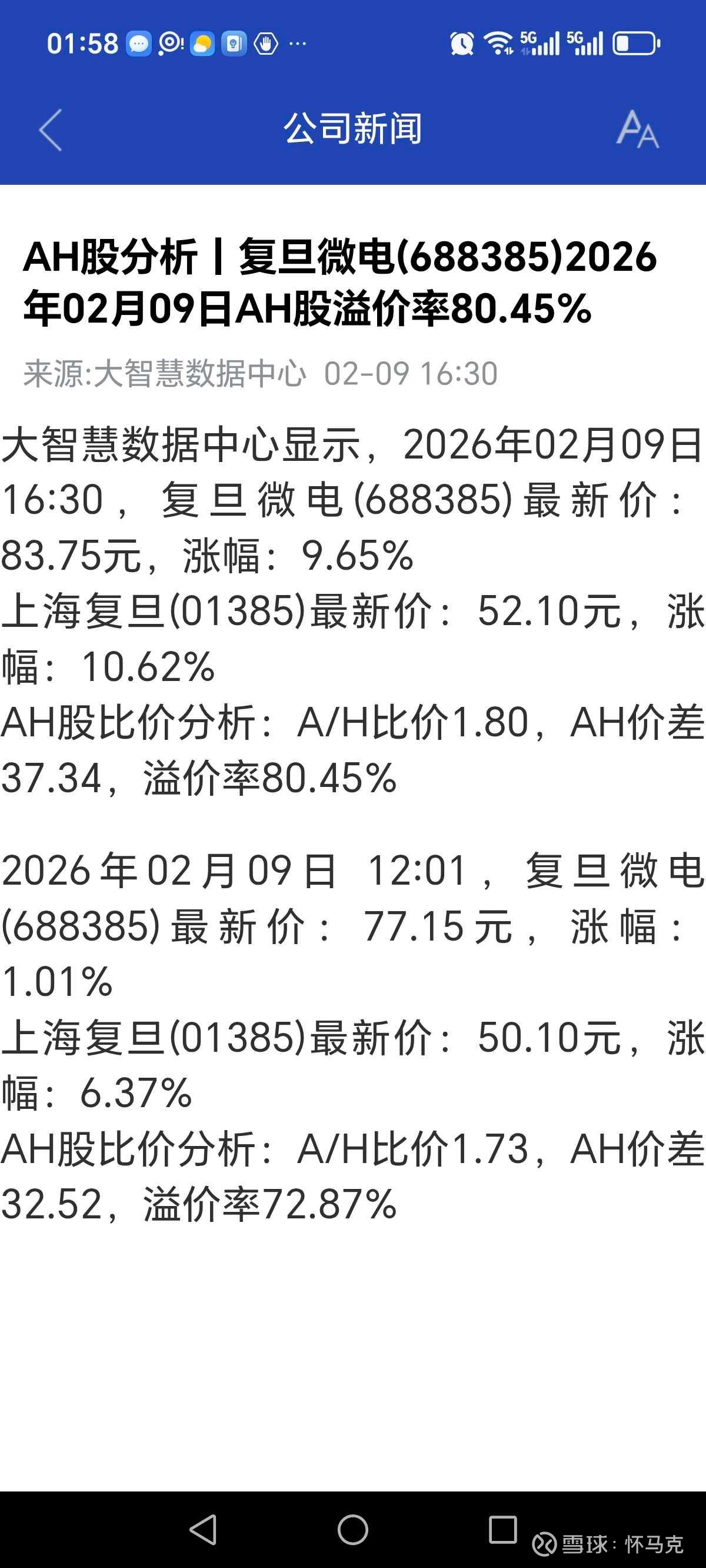 2026年2月9日16:30,复旦微电A股最新价83.75元,涨幅9.65%;H股(上海复旦01385)最新价52.10元,涨幅10.62%。A/H比价1.80,AH价差37.34,溢价率80.45%,A股相对H股显著溢价,反映A股市场对公司国产替代与航天业务的更高预期。