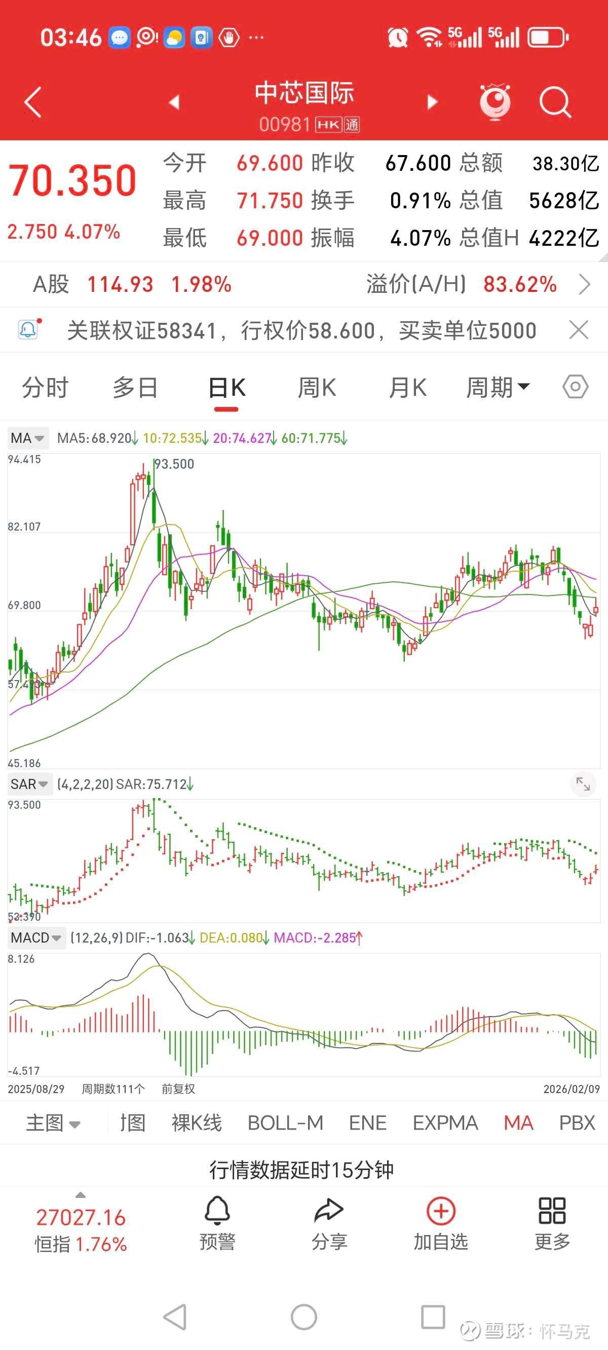 卖一:83.76元,2手;卖二:83.77元,87.93手;卖三:83.78元,13手;卖四:83.79元,4手;卖五:83.80元,131手