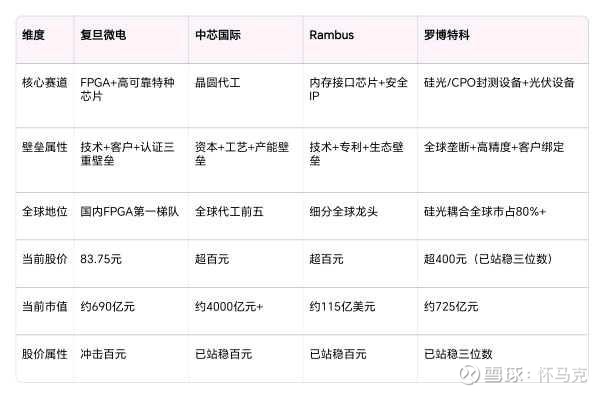 罗博特科依靠设备赛道+全球垄断走牛;Rambus依靠接口芯片+AI算力走牛;中芯国际依靠国产替代+工艺壁垒走牛。复旦微电依靠芯片设计+FPGA国产替代+航天刚性需求走牛,赛道级别、壁垒级别、资金偏好完全同档。