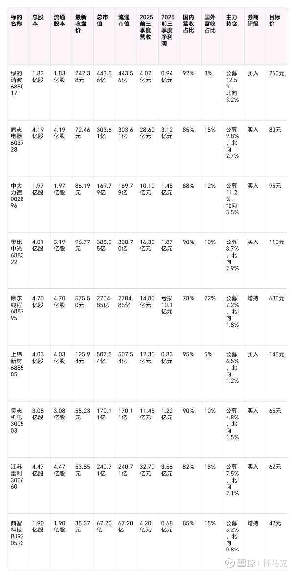 标的名称 总股本 流通股本 最新收盘价 总市值 流通市值 2025前三季度营收 2025前三季度净利润 国内营收占比 国外营收占比 主力持仓 券商评级 目标价
