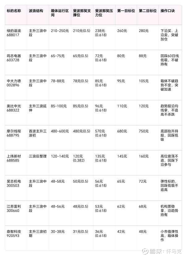 标的名称 波浪结构 箱体运行区间 斐波那契支撑位 斐波那契压力位 第一目标位 第二目标位 操作口诀