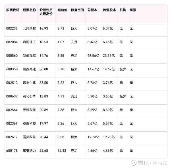 股票代码 股票名称 阶段性历史最高价 当前价 修复空间 总股本 流通股本 机构 研报