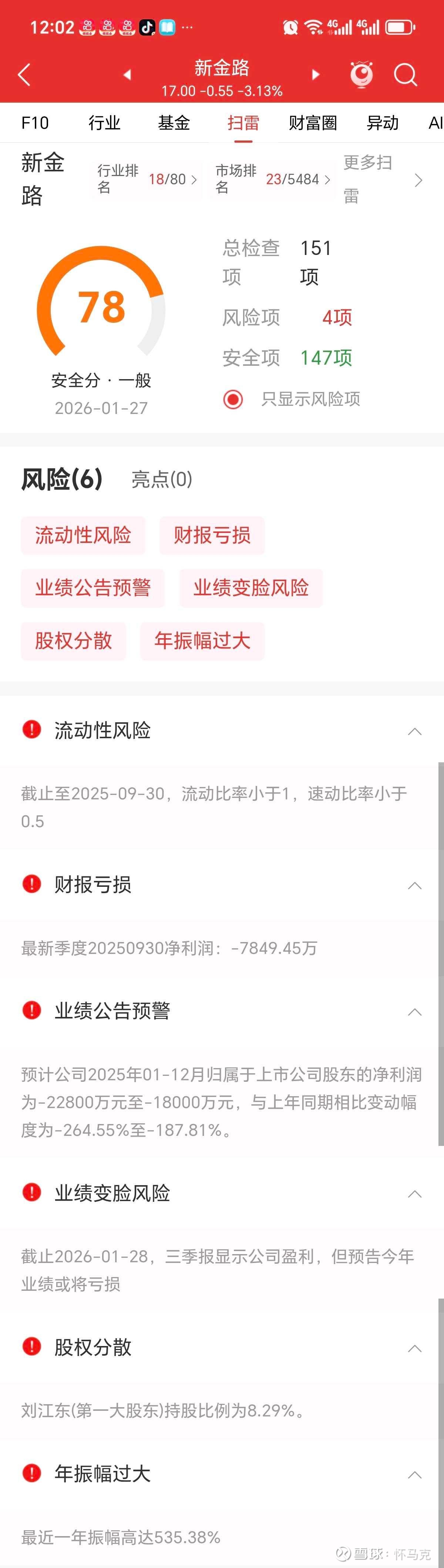 新金路是典型的周期主业亏损叠加资源转型预期的题材标的,本轮涨幅完全由情绪与资金驱动,从低点3.61元到高点20.48元历时339天,基本面并未提供相应支撑。全维度数据显示,公司营收高度依赖传统化工,矿业贡献微乎其微,财务与偿债指标全面弱于同行。技术形态上主升浪已结束,高位鱼尾行情博弈加剧。股价走势更多反映资金情绪,而非企业真实价值。结论明确:故事真实,业绩落空,股价泡沫化,只适合短线博弈,不具备中长期价值投资基础。