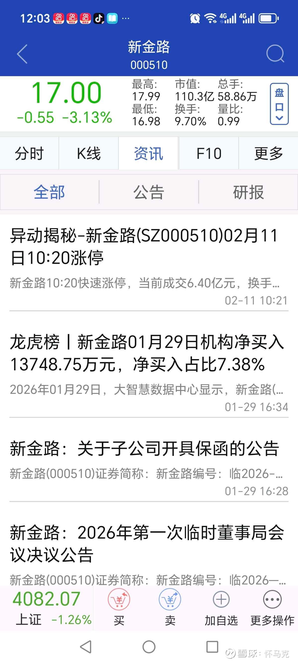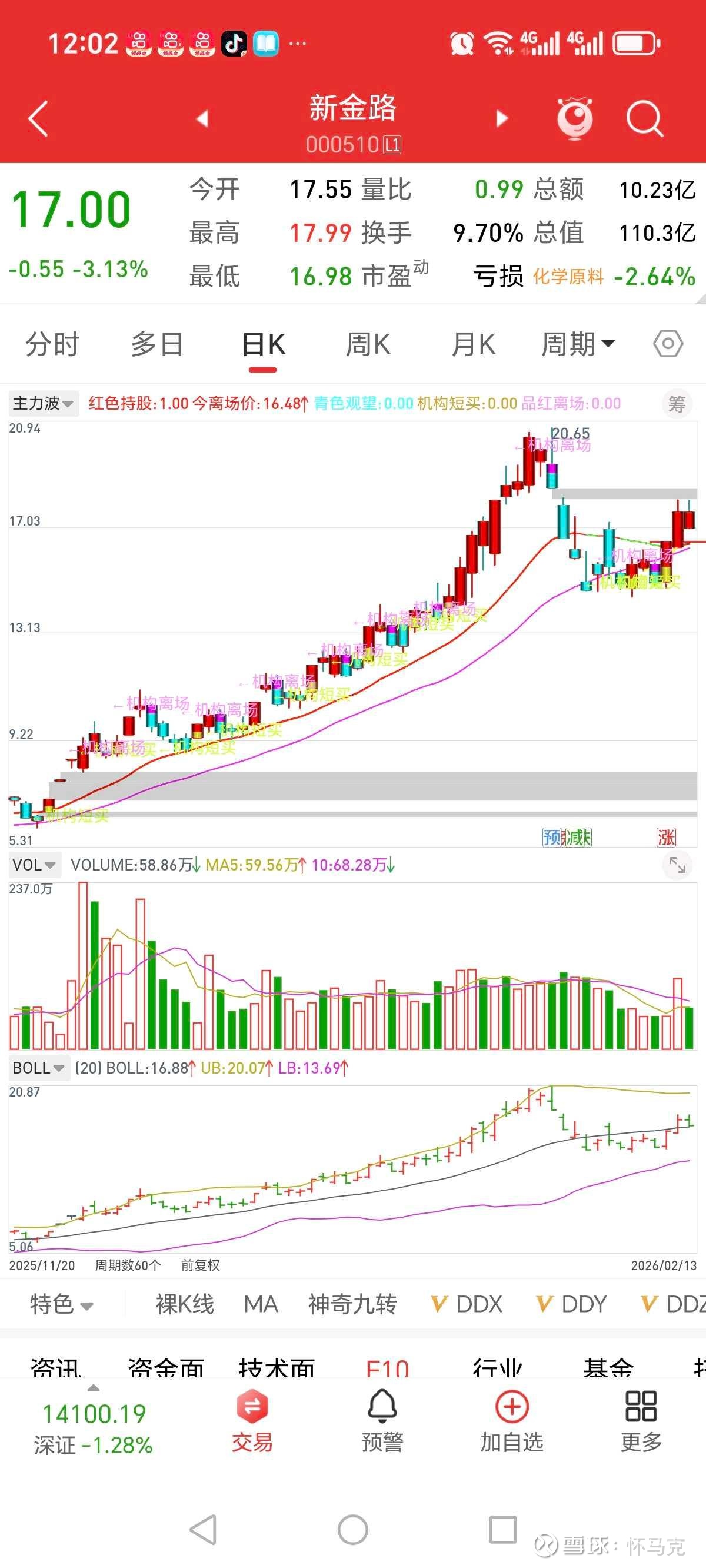 新金路是深交所主板上市企业,股票代码000510。该股自2025年2月21日低点3.61元起步,至2026年1月26日触及高点20.48元,阶段最大涨幅达到467%,全程自然日运行339天,交易日234天,当前市值110.3亿元。股价上行核心驱动来自市场对栗木矿业钽铌锡钨资源转型的预期,但基本面层面,公司2025年前三季度营业收入12.60亿元,同比下降16.82%,归母净利润亏损7849.45万元,同比下降129.38%,流动比率0.72、速动比率0.30,短期偿债压力突出。资金层面以游资主导、机构波段套利为主,周度换手率均值12.35%,整体处于高位箱体鱼尾行情,风险收益比严重失衡。