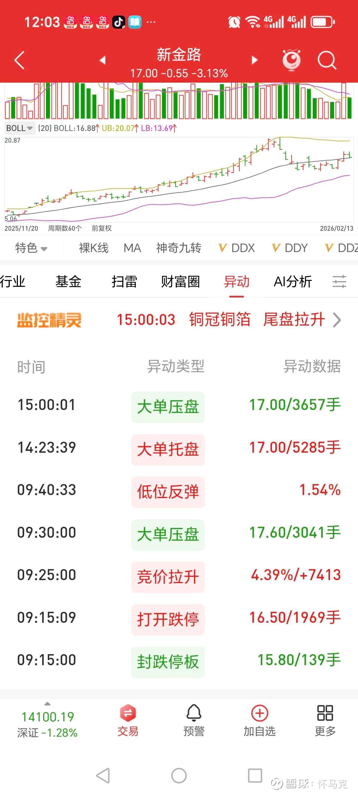 以2025年2月21日低点3.61元为起点,按照斐波那契比例测算,1.0倍目标7.22元,2025年5月中旬实际高点7.0元。1.618倍目标9.45元,2025年7月下旬实际触及10.1元。2.618倍目标13.06元,2025年11月上旬实际低点13.5元。3.618倍目标16.66元,2025年12月下旬实际中枢17.0元。4.236倍目标18.95元,2026年1月中旬实际次高19.2元。5.0倍目标21.69元,2026年1月26日实际高点20.48元。自高点回撤后,0.236支撑位于17.2元,2026年2月13日当前收盘价17.0元。0.382支撑15.5元,2026年2月11日实际低点15.63元。0.5支撑14.2元,0.618支撑12.9元,目前尚未触及。