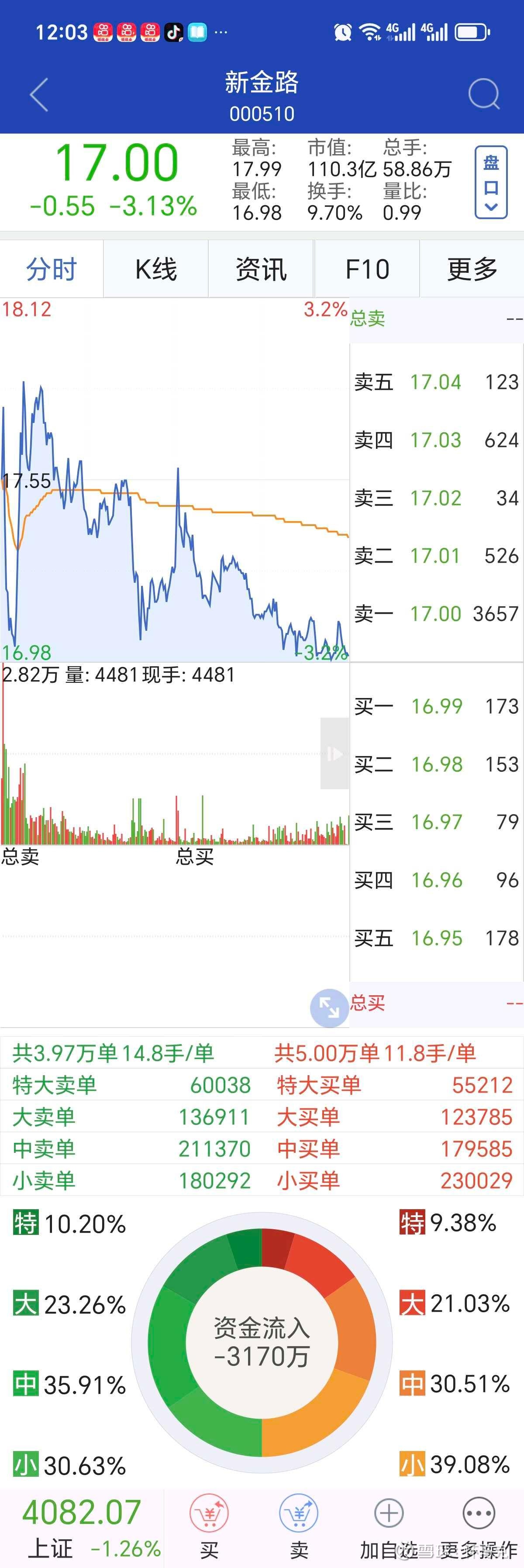 9:15,15.80元的跌停封单一度压制盘面,随后1969手买单在16.50元位置快速承接,打开下行空间。9:25,7413手集合竞价买单集中出现,将股价瞬间拉升4.39%。开盘之后,17.60元位置出现持续压单,形成阶段性阻力。午后14:23:39,17.00元位置出现托盘资金,构筑短时防线。收盘前,卖单再度压制,最终收于17.00元。全天特大卖单与特大买单博弈激烈,资金净流出3170万元,多空分歧明显。
