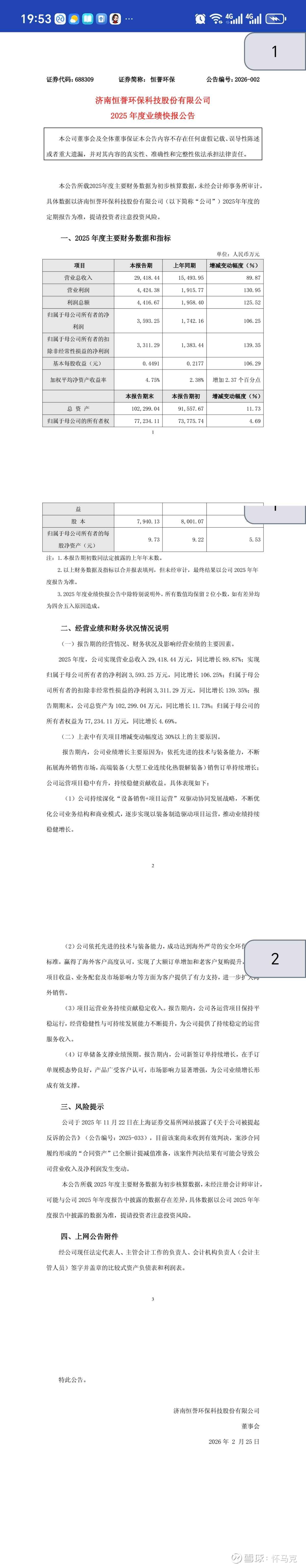 恒誉环保(688309)为有机固废热裂解装备龙头,国家级专精特新小巨人,主营废轮胎、废塑料、危废裂解设备销售与项目运营。本轮股价六连阳(2月20–27日)核心驱动为2025年业绩快报翻倍、海外大额订单落地、环保及再生材料政策催化,叠加游资与散户合力推升。本文从盘口、今日及近期走势、资金面与主力、基本面、财务、技术面、消息面、行业地位、股本股东、两融、换手率、主力思路、后市、散户策略等维度展开,所有数据均来自上交所公告、公司业绩快报、东方财富、同花顺等公开渠道并经交叉验证。截至2026年2月27日收盘,股价报42.73元,单日涨幅6.19%,总市值33.93亿元。