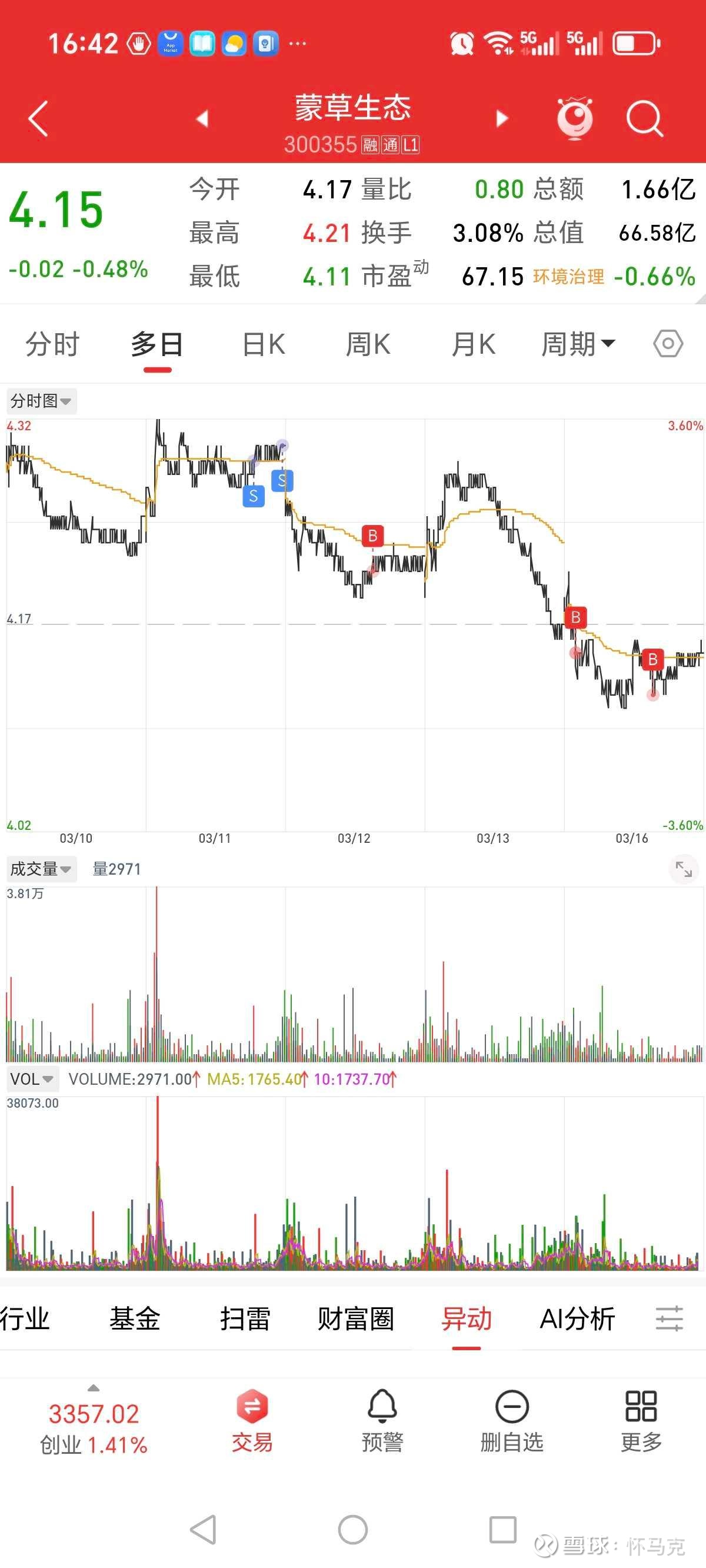 3月12日互动平台回复披露后,公司股价收于4.22元,总市值67.70亿元。3月13日股价微跌1.18%至4.17元,总市值66.90亿元,并未出现大幅炒作。核心原因在于矿业布局仍处于最早期阶段,短期不构成实质利好,光伏治沙落地信息属于市场预期内的补充,同时公司偏高估值也压制了股价弹性。