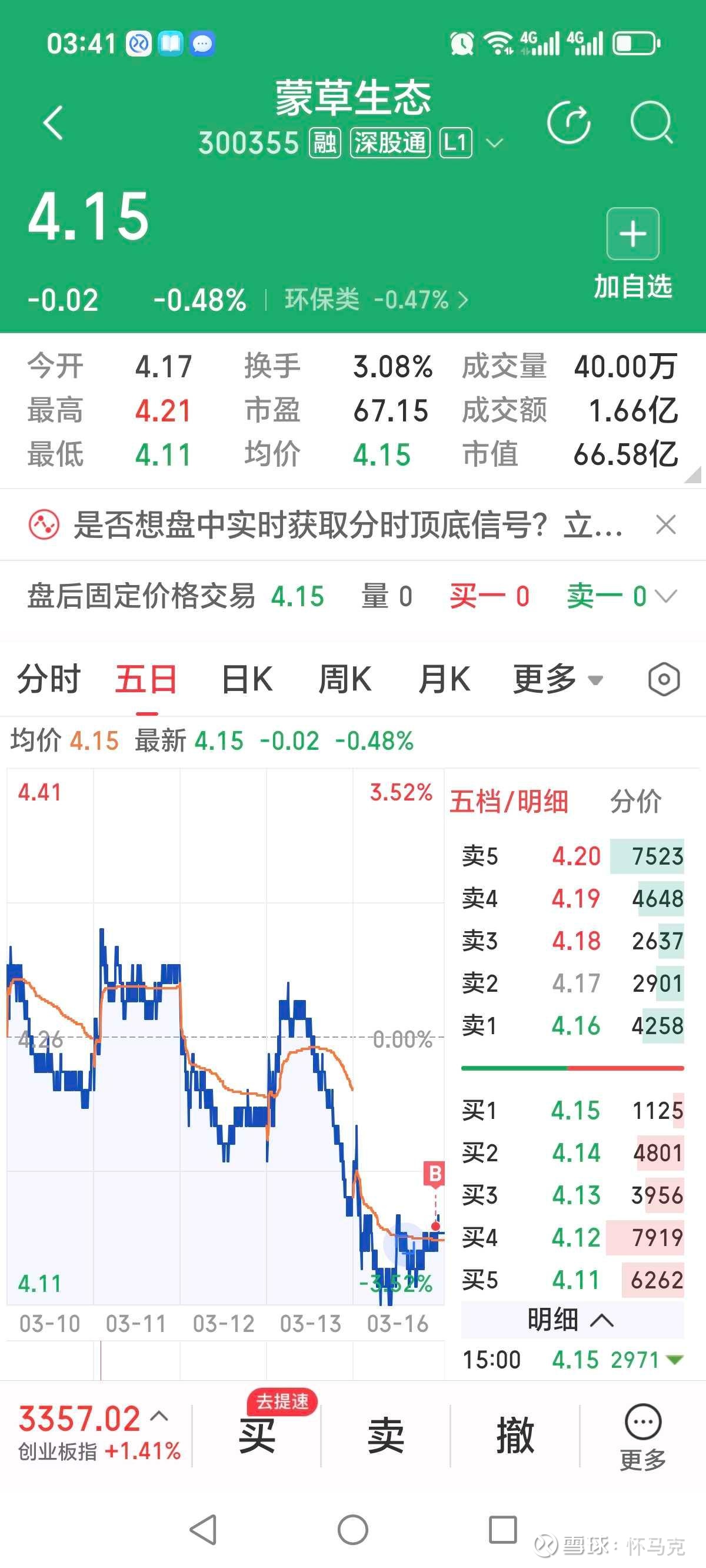 3月16日中标公告当日股价平开报4.17元,全天窄幅震荡,最高触及4.21元,最低探至4.11元,最终收于4.15元,微跌0.48%,换手率3.08%,成交额1.66亿元,总市值66.58亿元。整体呈现利好落地前缩量震荡格局,无明显资金抢筹动作,股价在4.1至4.2元区间获得支撑,上方4.3元为短期压力位,量能较前几日小幅萎缩,市场对晚间中标公告提前反应有限。