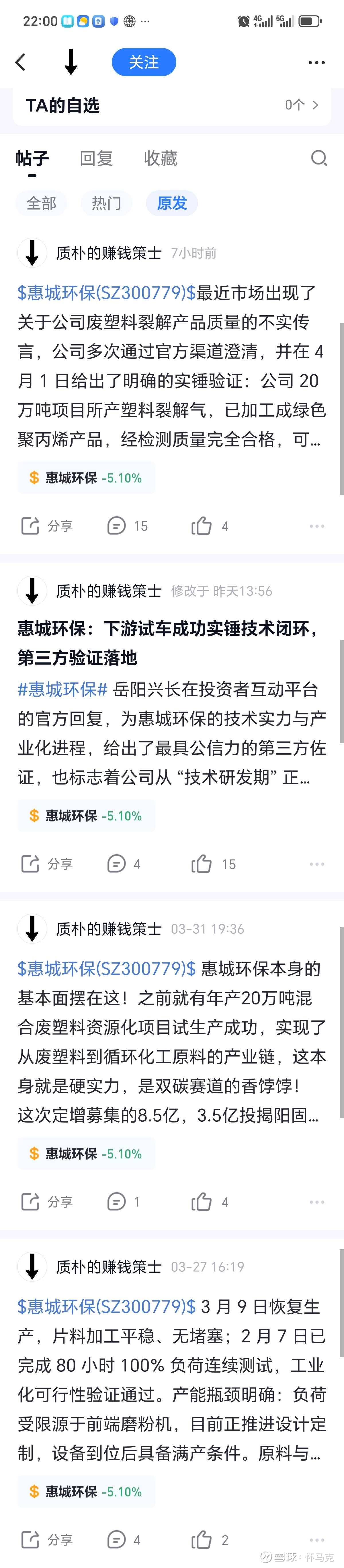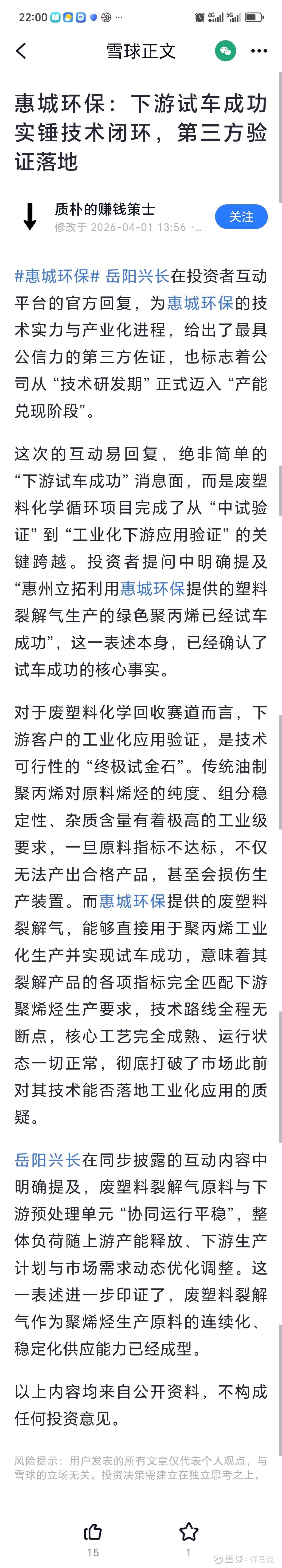 截图五来自雪球个人ID质朴的赚钱策士在4月1日发布的内容,宣称惠州立拓利用惠城裂解气试车成功并形成技术闭环,将互动易简单回复强行解读为第三方实锤,全文无任何验收单据、无试车时长、无稳定量产数据,纯属个人主观放大与吹票话术,也对应前文抱团洗地、无实锤支撑的判断。