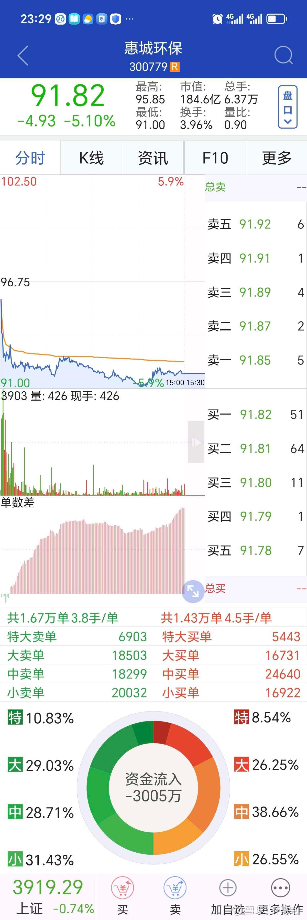 截图七为该ID在4月2日发布的最新维稳内容,重述4月1日互动易表述,强调传言不实与产品完全合格,明显为配合股价走势进行情绪维稳,而当日惠城环保股价高开低走大跌5.10%,主力资金呈现大幅净流出状态,市场用真实走势直接否定所谓利好。
