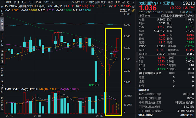 2月11日,港股市场走势分化,汽车板块异军突起!截至10:28,$港股通汽车ETF汇添富(SZ159210)$ 涨超2%,冲击四连涨。