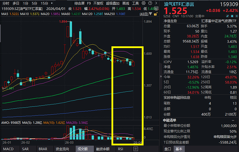 4月1日,A股市场震荡上行,沪指涨超1.5%,油运股拉升,油气板块冲高!截至13:30,全市场油气纯度更高的$油气ETF汇添富(SZ159309)$ 涨超2%,成交额1亿元,交投活跃。