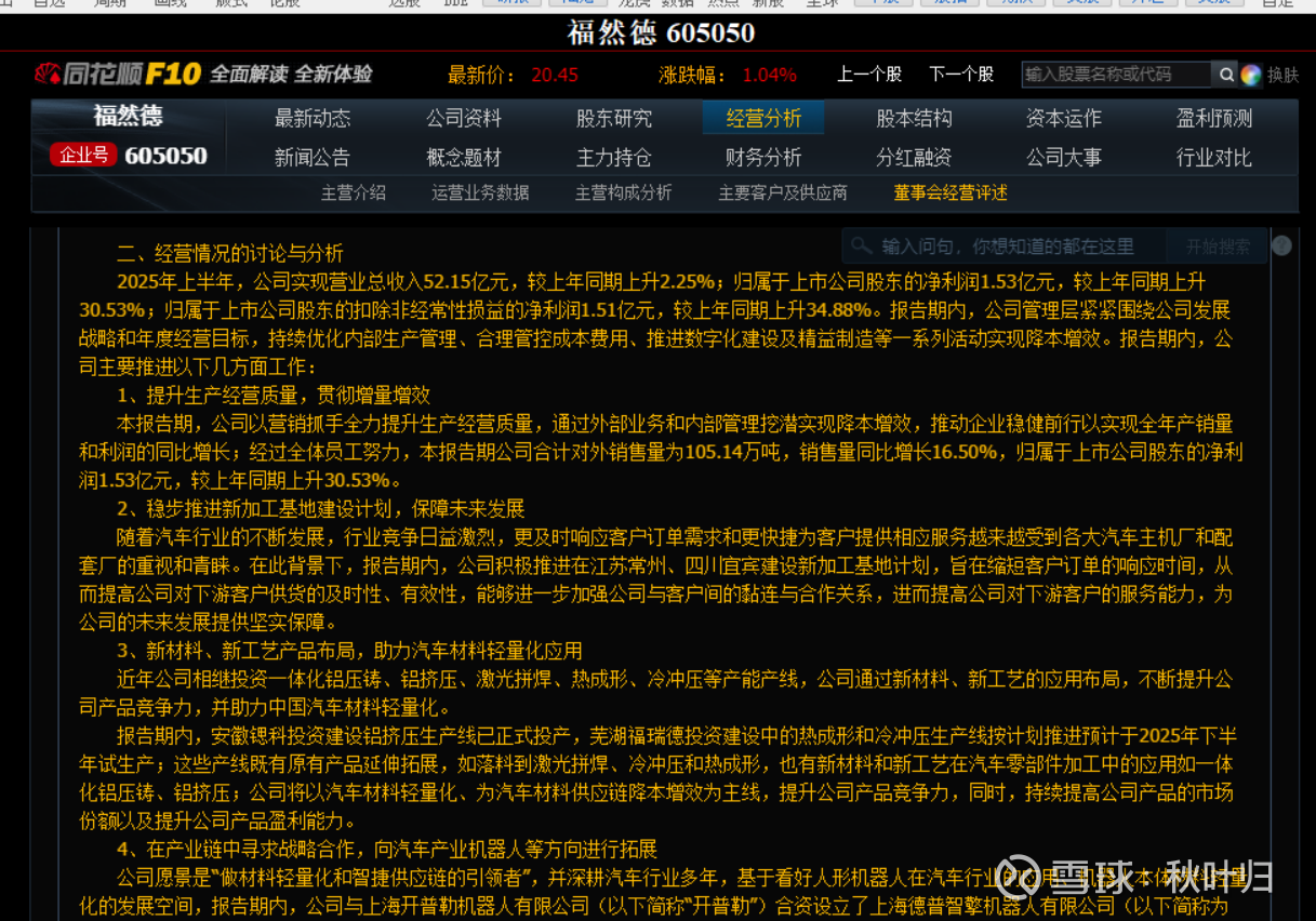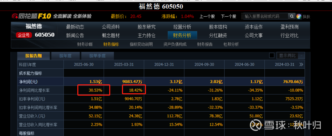 $福然德(SH605050)$ 先看福然德的基本面情况,首先公布的半年报显示,归母净利润铜币增长30.53%。