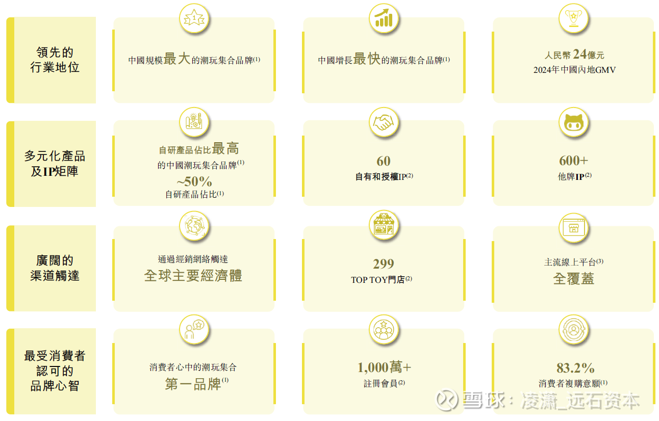 Top Toy是中国规模最大、增速最快的潮玩集合品牌。2024年中国内地GMV人民币24亿元,2022年至2024年,GMV复合年增长率超过50%,是中国增长最快的潮玩集合品牌,亦是年GMV突破人民币10亿元历时最短的中国潮玩品牌。其中自研产品收入占比接近50%。