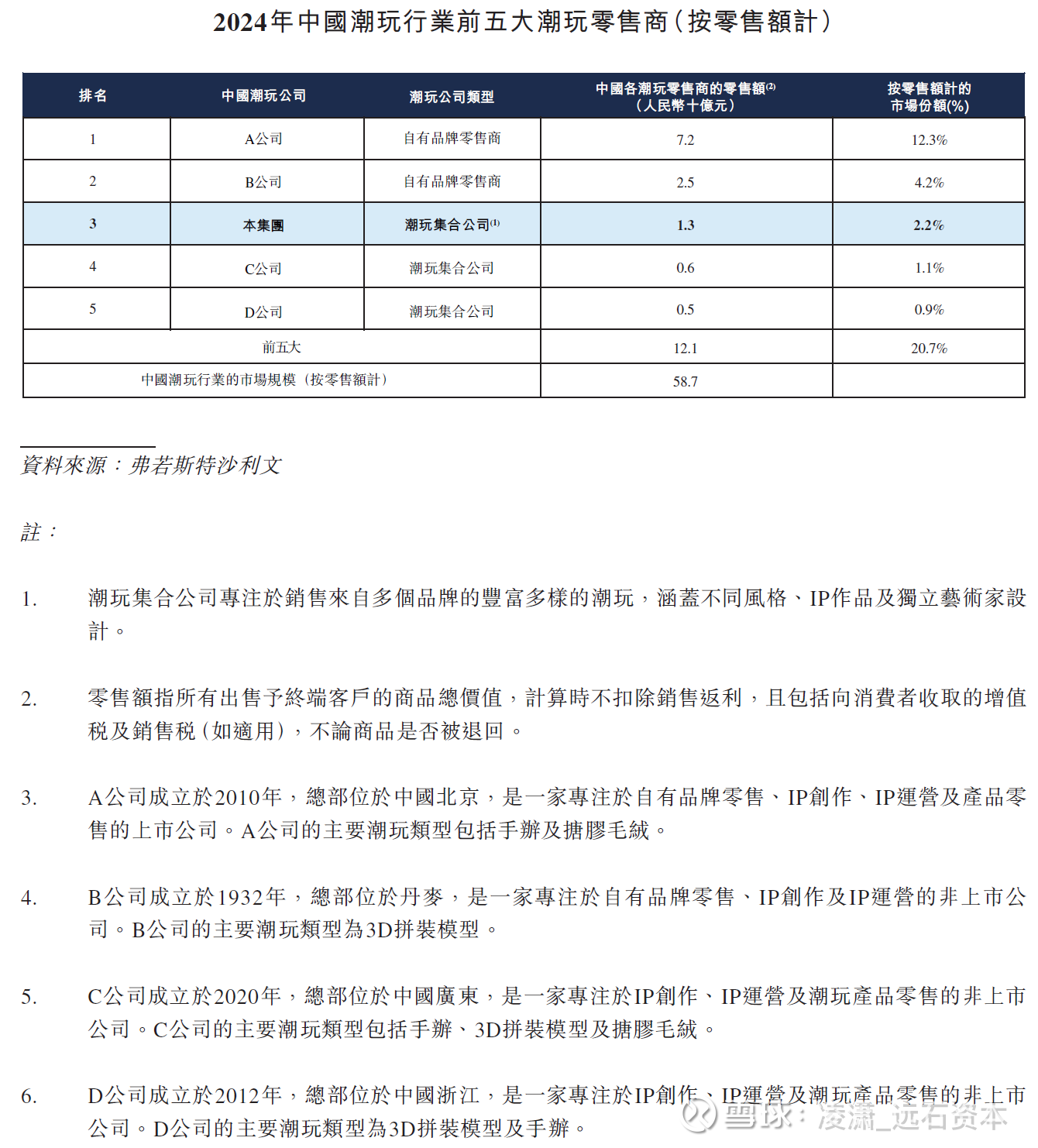 按零售额计,Top Toy 2024年在中国的零售额达人民币13亿元,在中国潮玩行业排名第三,市场份额为2.2%。中国潮玩行业前五大潮玩零售商的市场份额合计达20.7%,呈现相对分散的市场格局。招股书没有披露另外四家的名称,但根据下图信息可知,排名第一的是泡泡玛特,第二是乐高,第四是52Toys,第五是奥飞娱乐。
