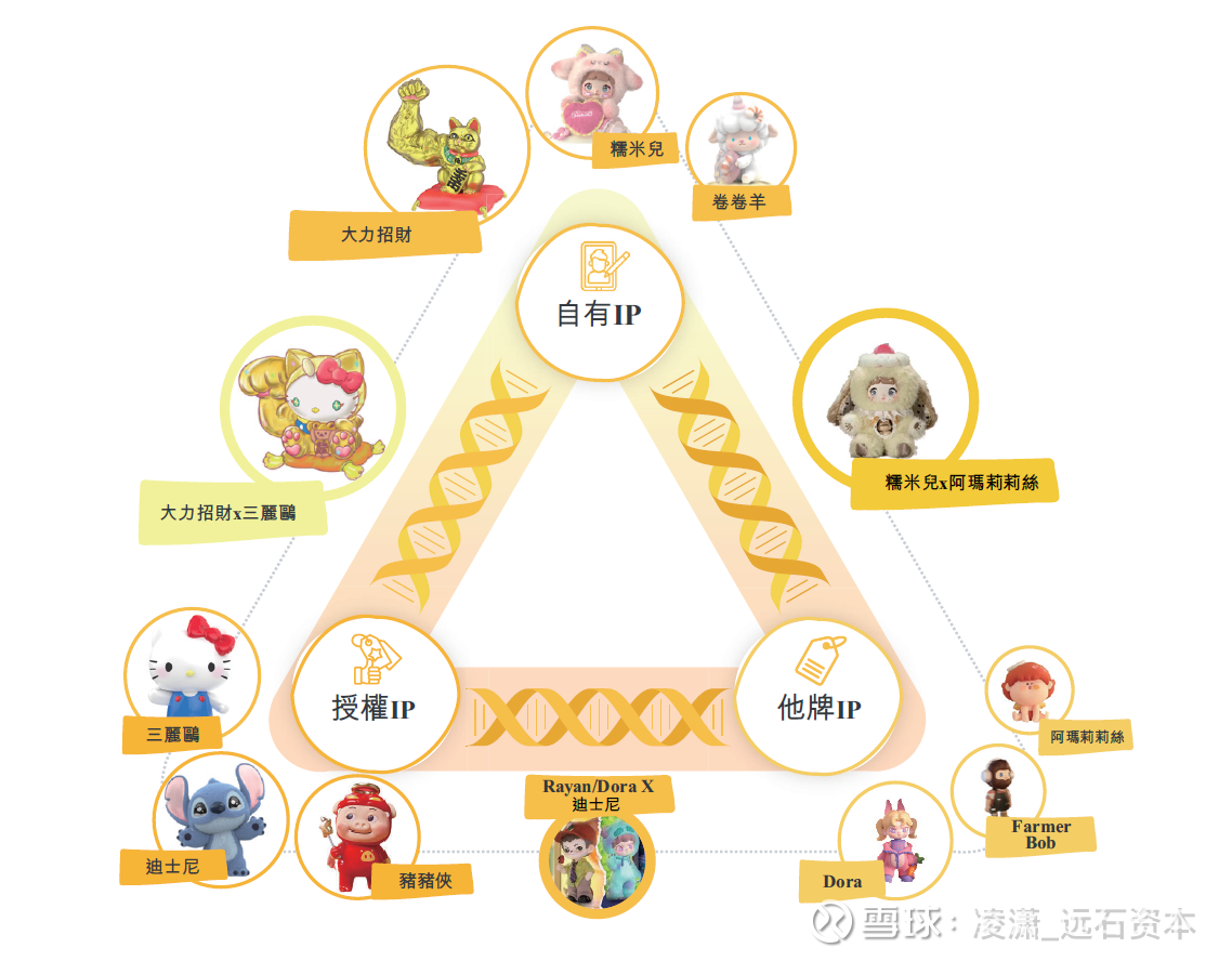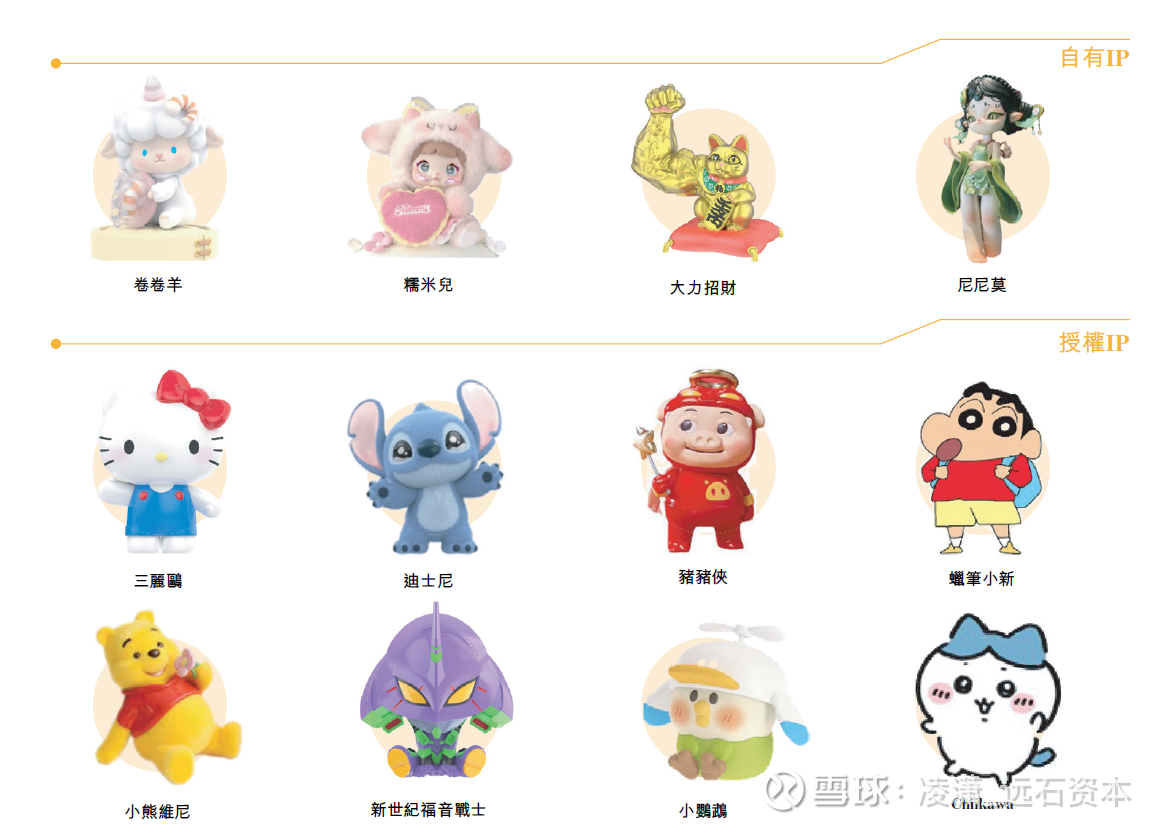 公司构建了涵盖自有IP、 授权IP及他牌IP的全面且动态的IP矩阵。 截至招股书日期,公司拥有17个自有IP及43个授权IP。自有IP方面,成功孵化出了如大力招财、卷卷羊及糯米儿等,并在2025年8月,通过收购多个设计师IP(如尼尼莫)进一步丰富了IP组合。授权IP方面,与全球顶级IP合作伙伴(包括三丽鸥、迪斯尼及蜡笔小新等)建立了长期稳定的合作关系。