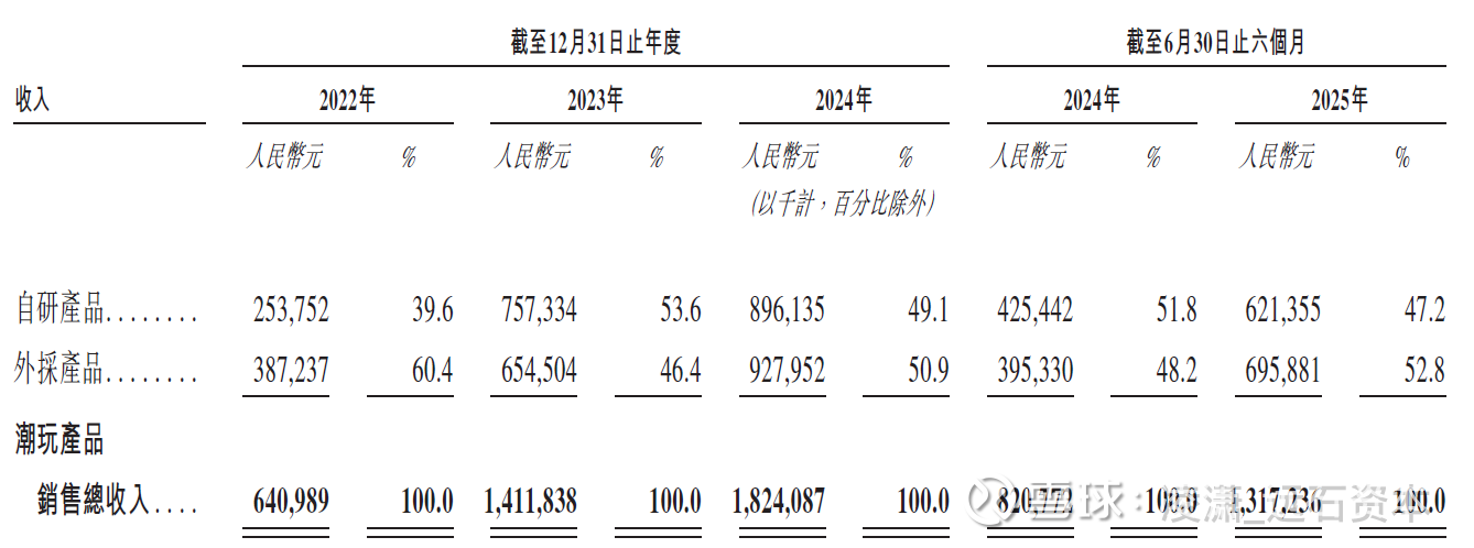 截至2025年6月30日止六个月,公司的销售总收入为13.17亿元人民币,其中6.21亿元为自研产品(包括自有IP产品和授权IP的自研二创产品),6.96亿元为外采产品(即采购其他IP的成品直接销售)。