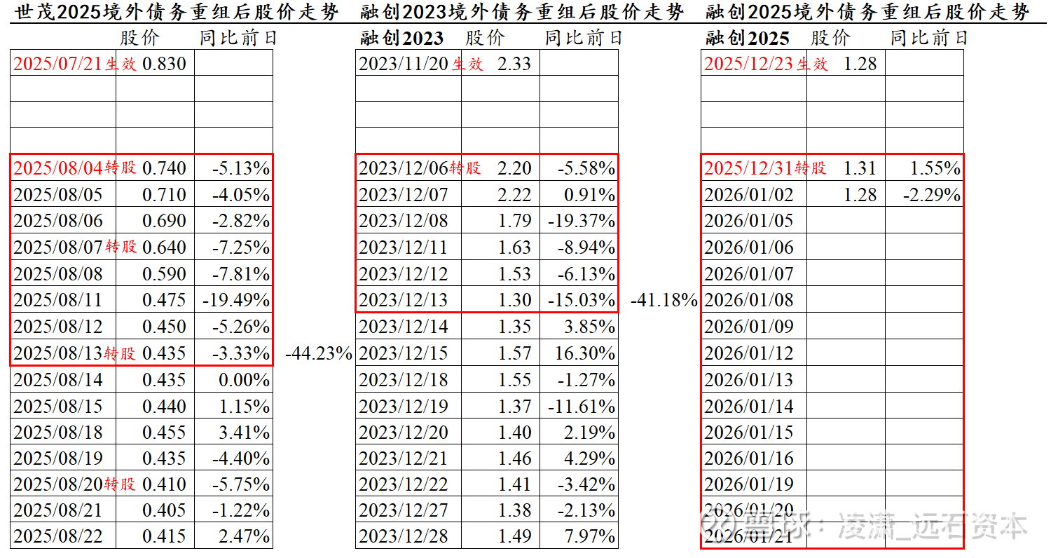 作为深度研究地产板块的博主,我们还是直接用历史数据说话。下图左侧汇总的是世茂债转股入市后的每日股价走势及累计跌幅(-44%),中间汇总的是融创自己2023年债转股入市后的美如股价走势及累计跌幅(-41%),右侧汇总的是本次融创股价记录,刚刚记录到1月2日,下面的空白会如何填写?我们拭目以待。