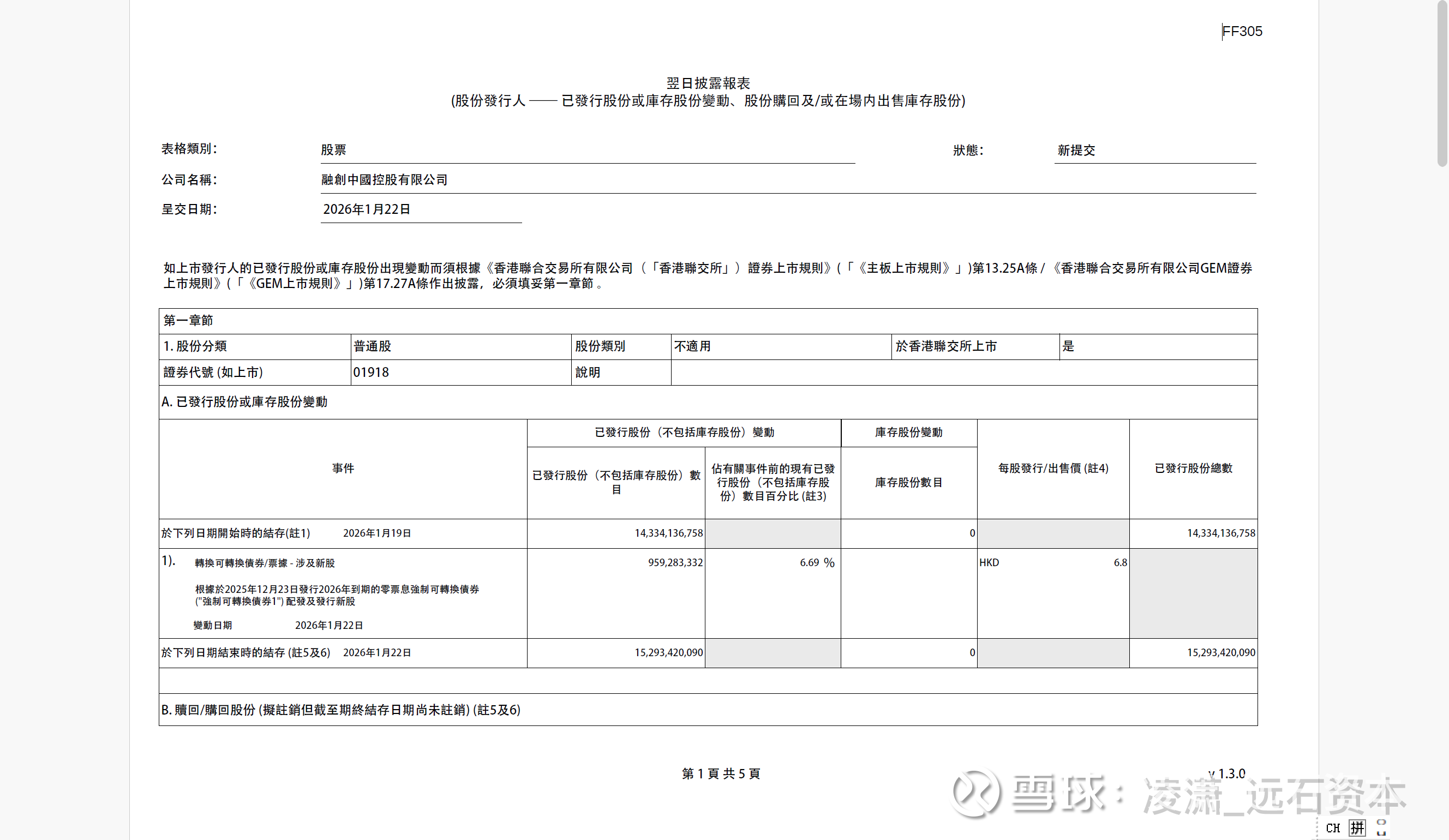 根据今天早上查到的信息(如下图),融创中国又一批债转股股票已在昨天进入股东账户:汇丰12.94亿股。这批债转股的量比之前要大很多,公司股价面临比前几天更大的抛压。同时,根据公司昨天17:30发布的《翌日披露报表》,公司根据MCB1又新发行了9.59亿股,预计会在未来几个工作日里逐步进入债权人账户,并开始抛售。公司总股本已从这轮债转股前的114.7亿股增加到了152.9亿股。