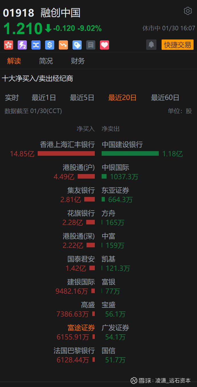 下面我们最后盘点一下融创债转股的情况,给这个系列文章结个尾。根据近20日的十大净买入/卖出经纪商(如下图)(20个交易日刚好覆盖整个1月份,买入和卖出两侧都没有出现的名字,说明已经抛完了;只出现在买入侧的,说明已经转股但还没抛完),此前陆续转股的法巴1.4亿股、美林1.35亿股等都已经基本抛完了。还没抛的包括汇丰的14.85亿股、集友的2.81亿股、花旗的2.28亿股、国君的1.42亿股,仍然是堰塞湖悬头的状态。一旦这几家机构大幅抛售,融创的股价就会再次出现闪崩。