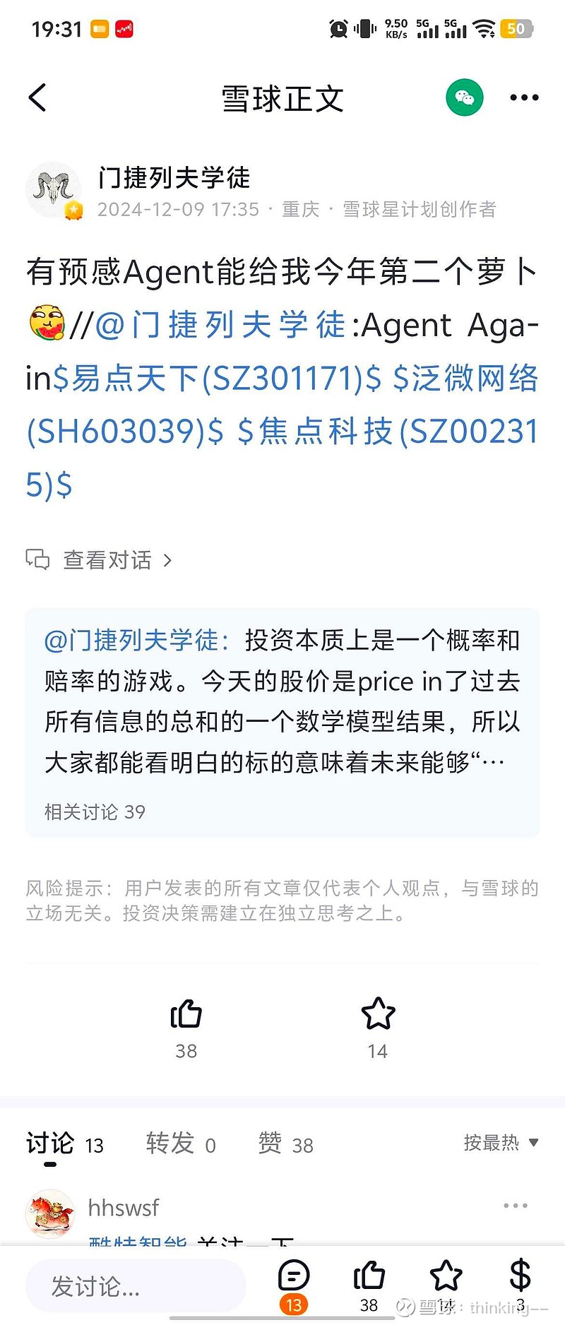 雪球很多大V,口口声声说a股AI应用公司都是诈骗公司。其实,在股市谁也不比谁赚的钱高尚没必要拉抬吧。以门捷列夫学徒为例子,其实他也不是没买过软件,在风口上的时候,他也一样屁颠屁颠的去买,还写长文布道呢,那时候就不是诈骗公司了?我一说这个,得,人家直接把我拉黑了。@作手F2049 @粲然一笑2021