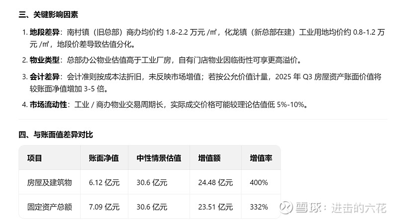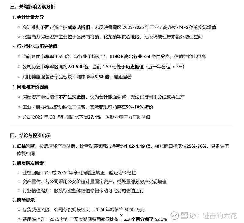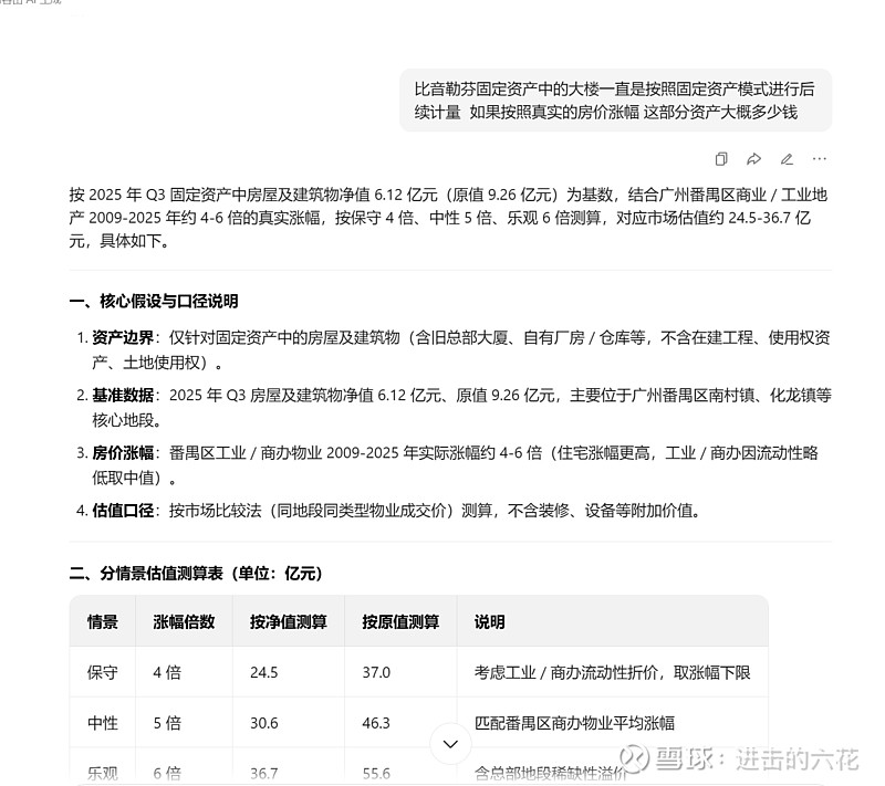 之前分析固定资产 的时候 发现比音本身手上有一栋大楼 现在折旧的净值是6亿多 实际上这个房子是09年建造的 我用AI测算了下 如果以公允价值进行后续计量 这个大楼的实际价值是27-35亿 注意 注意 这栋大楼如果新的大楼的建成后出售 实际售价和账面净值的差额就是营业外收入 这里市净率按照真实变现价值 实际是低估了的 实际的市净率应该在1.1-1.2倍
