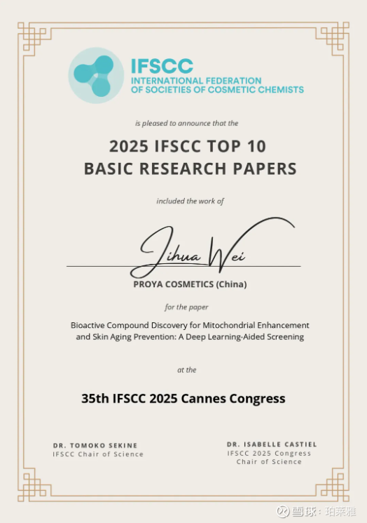 在AI技术的辅助下,珀莱雅研发团队成功且高效地筛选出具有增强线粒体功能,实现抗皱、紧致功效的活性化合物,并结合高通量图像分析与生物实验验证效果,开发出前沿复合配方,目前已应用于珀莱雅股份旗下主品牌珀莱雅“能量系列2.0”部分产品中。凭借这一突破性成果,公司荣获了有化妆品界“诺贝尔奖”之称的“2025国际化妆品化学家学会联盟大会(IFSCC)十大基础研究奖”,成为IFSCC历史上唯一获得该奖项的中国化妆品企业。此外,在头皮护理、屏障修护等细分领域,珀莱雅研发团队也已通过AI平台完成天然分子结构检索与作用靶点预测,为产品开发提供了精准的大数据支撑。
