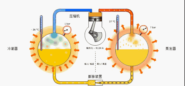 在用途上,冷凝器用来排放热量,蒸发器用来吸收热量。
